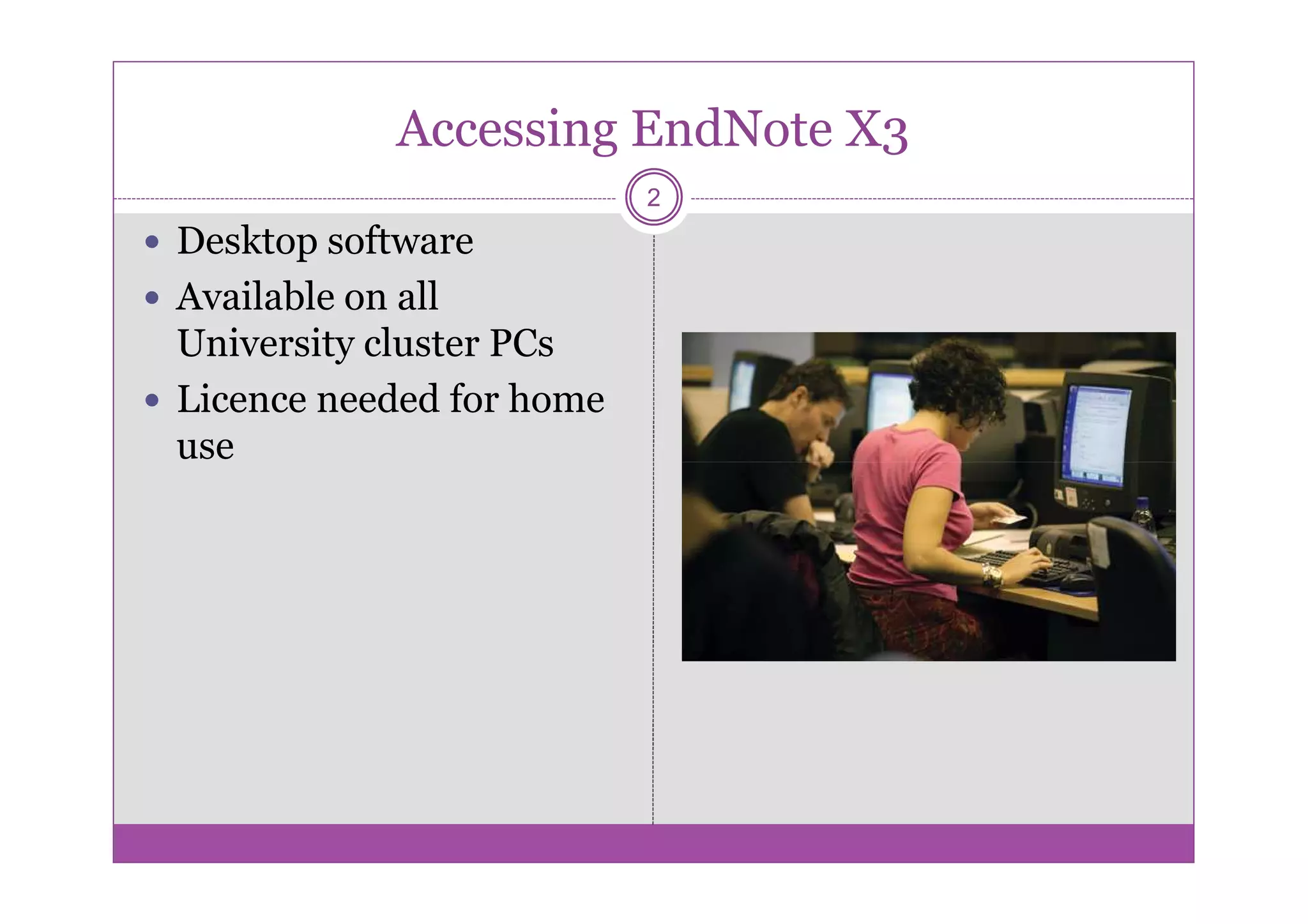 This document provides an introduction to EndNote X3 referencing software. It discusses accessing EndNote desktop and web versions, adding references from various sources, managing references by grouping and linking to files, using over 3600 reference styles, and tips for backing up and working with an EndNote library. Contact information is provided for troubleshooting and purchasing a home use license.
