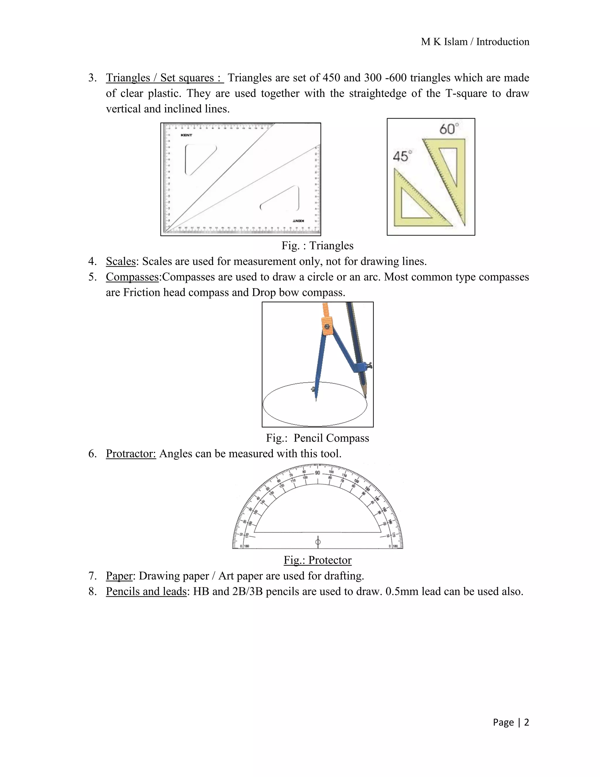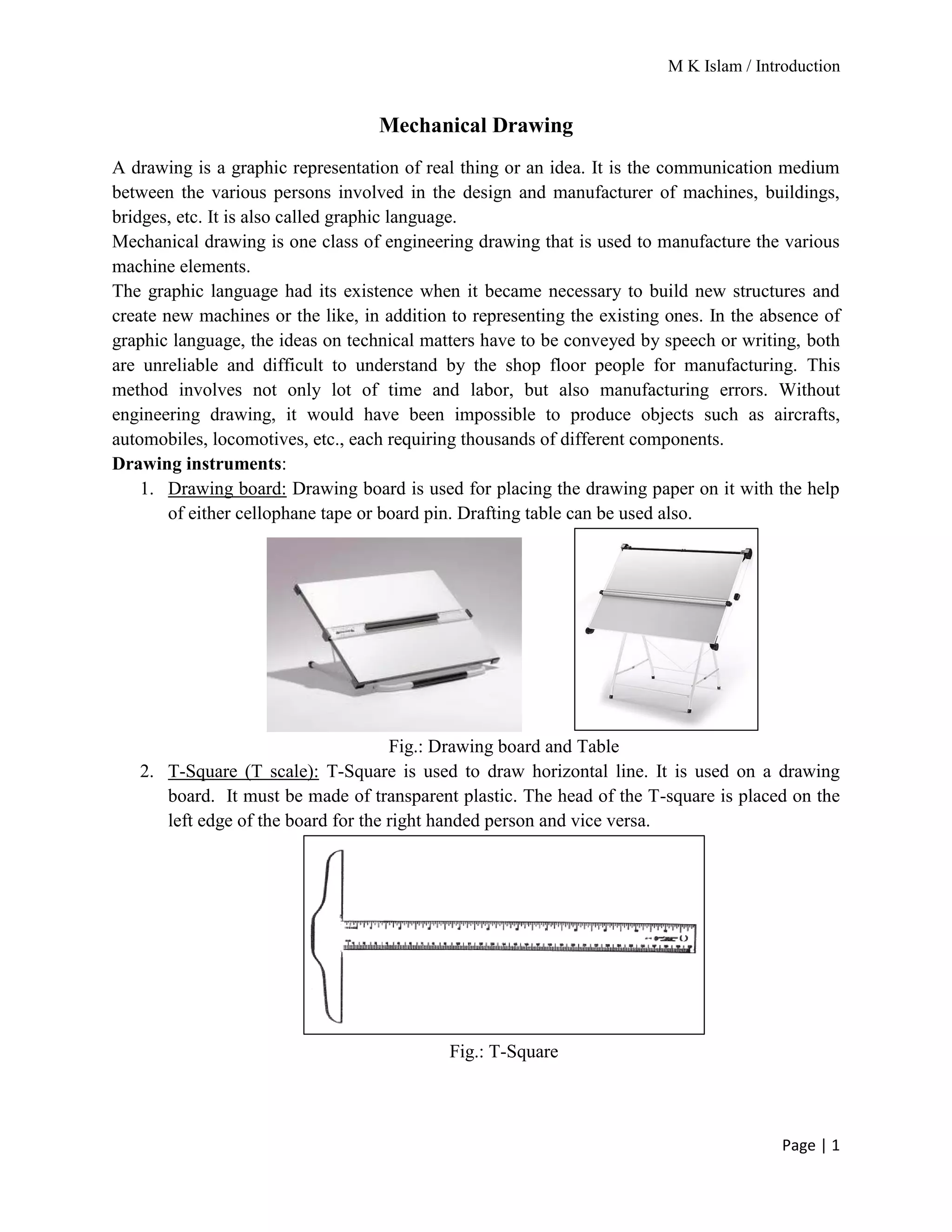 The document provides an overview of mechanical drawing, emphasizing its role as a communication medium in engineering for manufacturing and design. It outlines essential drawing instruments and techniques, including the types of lines used in drawings and the proper layout for dimensioning. Additionally, it details the different scales of drawing and the requirements for dimensioning techniques.