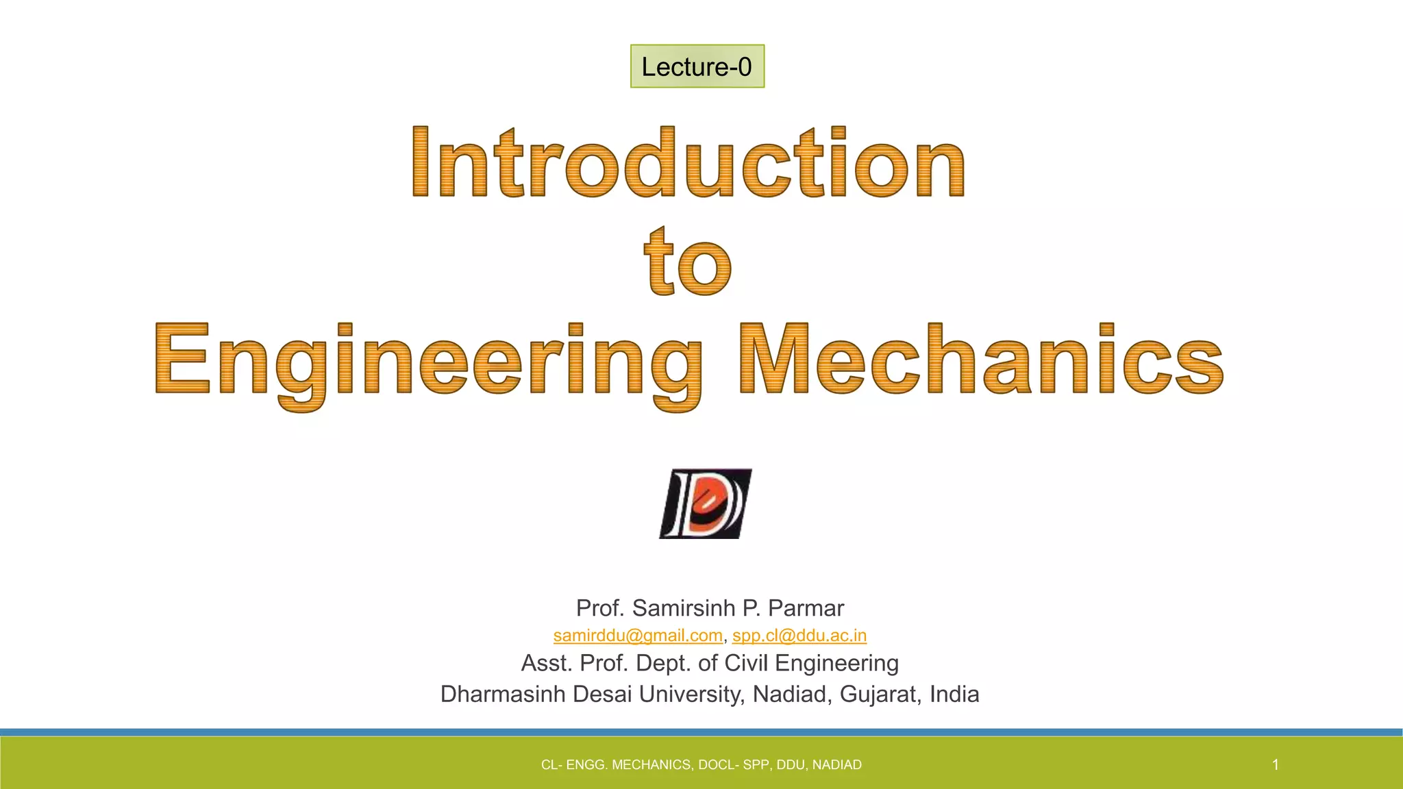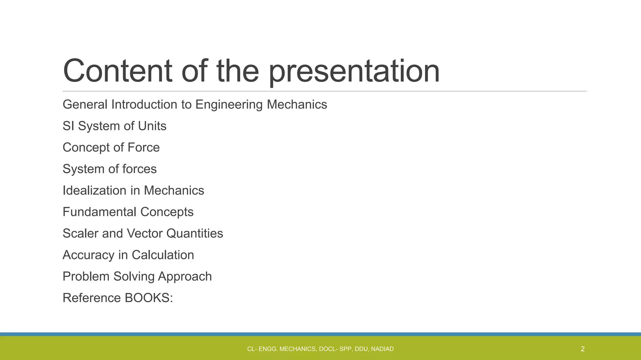 The document is a lecture presentation on engineering mechanics, covering fundamental concepts such as statics, dynamics, and the importance of force and its characteristics. It explains the SI system of units, idealizations in mechanics, and the differentiation between scalar and vector quantities, along with methods to add and subtract vectors. Additionally, it introduces the concepts of unit vectors and their application in vector calculation.