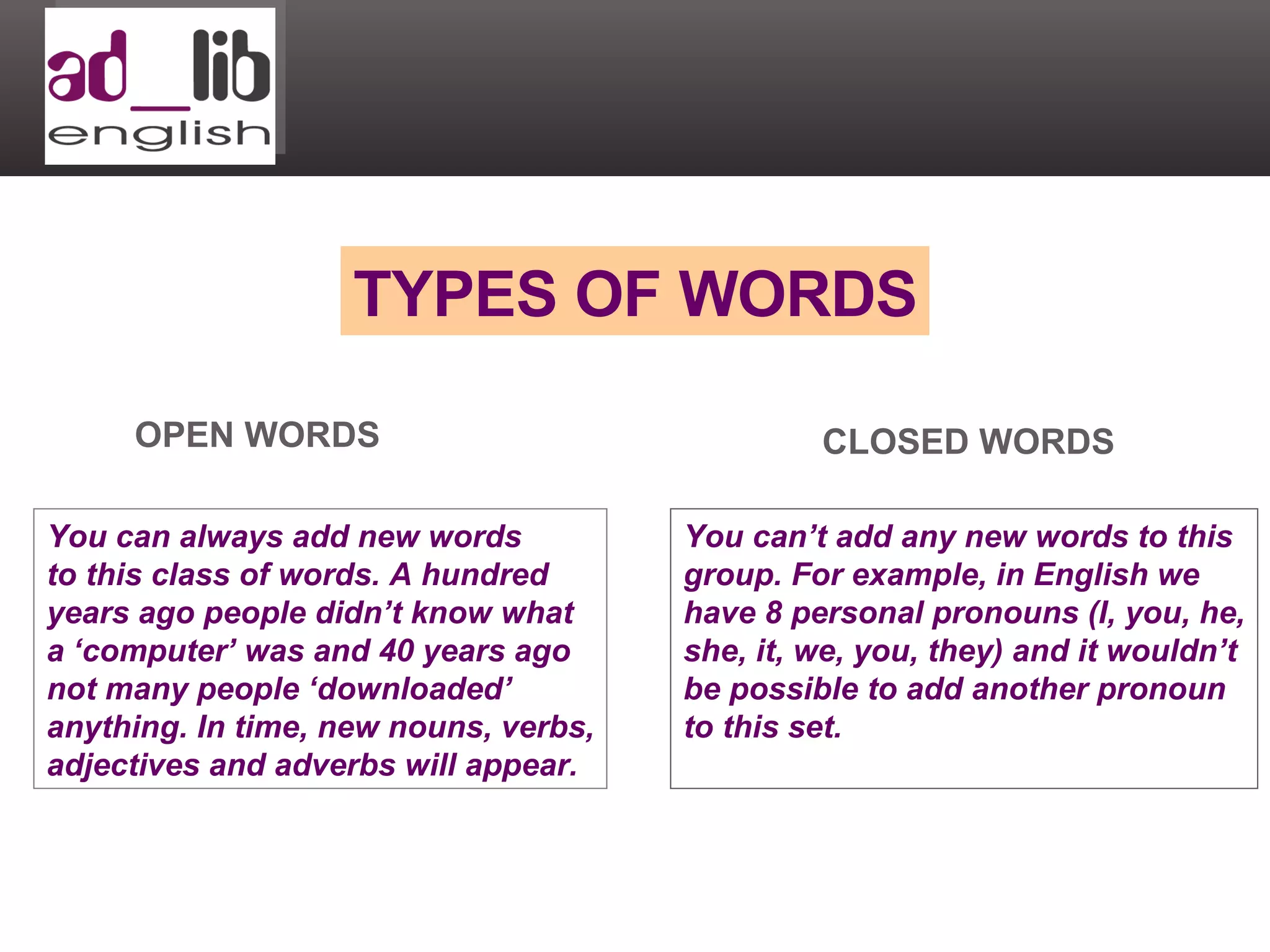 The document introduces various types of nouns in English, categorizing them into common vs. proper, concrete vs. abstract, and other classifications. It explains the characteristics and examples of these types, emphasizing how proper nouns are specific and often capitalized, while common nouns are general. Additionally, it notes the distinction between open and closed words, with open words allowing for new additions to the lexicon.