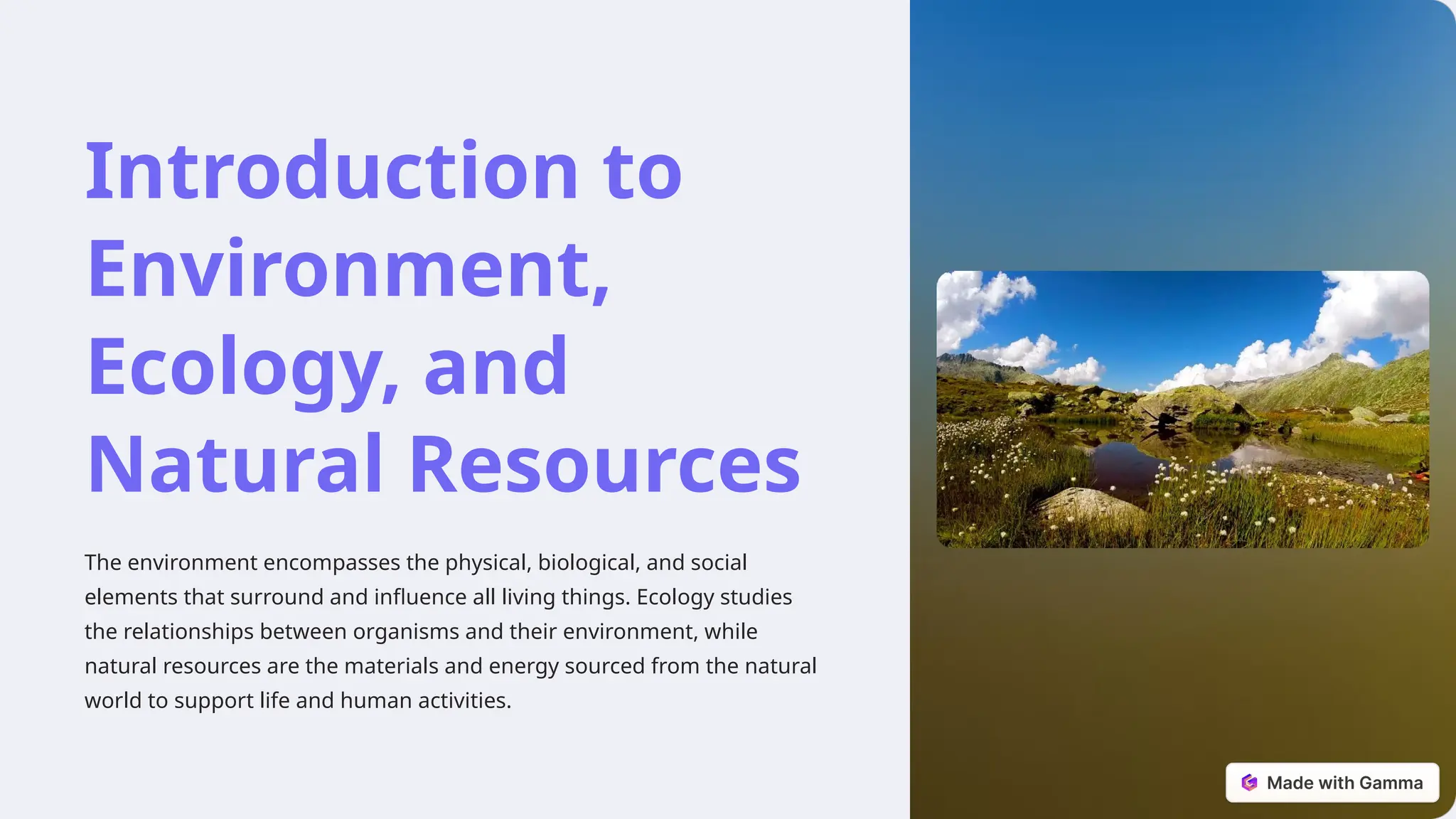 The document discusses the interplay between the environment, ecology, and natural resources, highlighting the importance of understanding carrying capacity and pollution. It addresses the socio-economic factors that affect human health and the environment, emphasizing the impact of fossil fuels and the benefits of renewable energy sources. The conclusion stresses the need for holistic management of these interconnected systems and the role of individual actions in promoting sustainability.