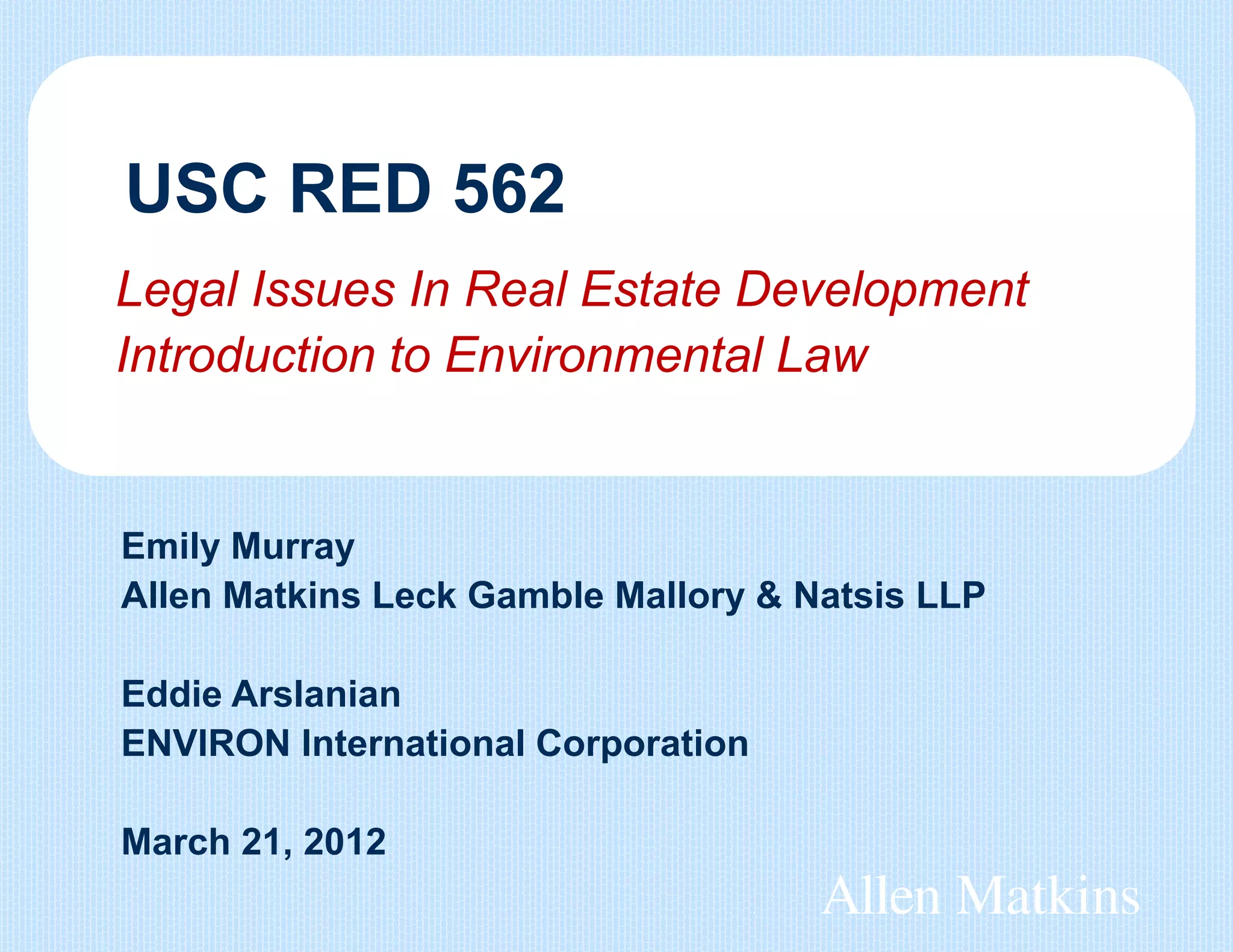 This document provides an overview and introduction to environmental law for real estate development projects. It discusses the key federal and state environmental agencies, major environmental laws such as CERCLA, RCRA, the Clean Water Act, NEPA, and CEQA. It also covers how environmental issues typically arise in real estate development, including during due diligence, entitlements/development, and litigation. Due diligence involves Phase I and Phase II environmental site assessments to identify contamination issues and compliance with "all appropriate inquiry" rules to assert defenses to liability. Negotiation strategies with sellers, agencies, and insurers can help developers mitigate environmental risks.
