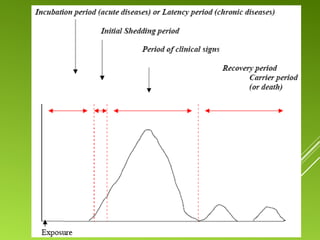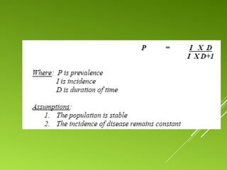 The document discusses the essential concepts of epidemiology, including the study of disease distribution, determinants of health, and the impact of emerging and re-emerging infectious diseases. It highlights the goals and objectives of epidemiology, such as identifying disease etiology, evaluating health measures, and understanding the roles of host, agent, and environment in disease causation. Various epidemiological study designs and methods, such as descriptive and analytical approaches, are outlined to assess disease incidence and prevalence, as well as to develop effective public health interventions.