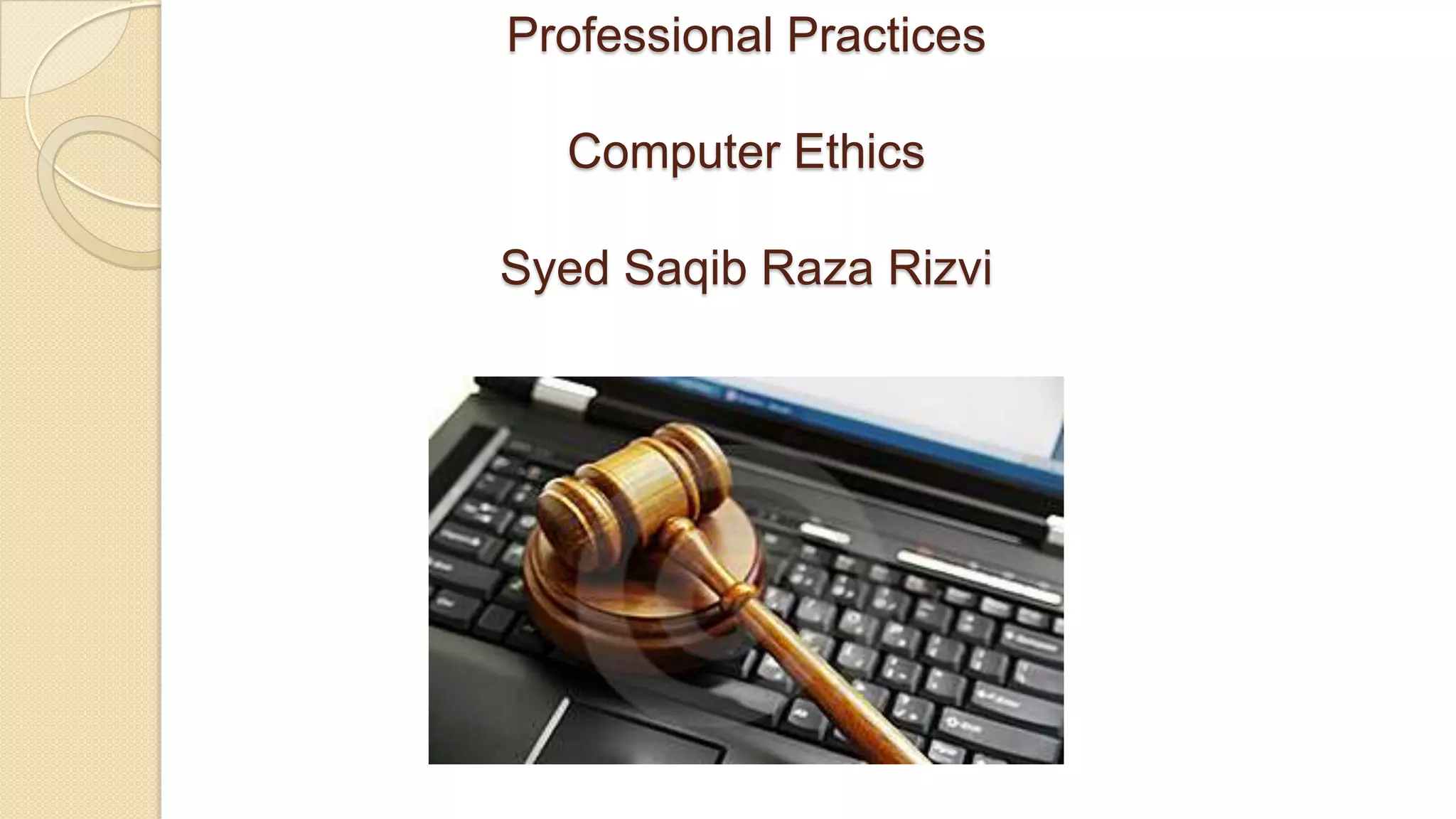 This document discusses professional practices and computer ethics. It begins with background on ethics according to Socrates, defining ethics as knowing the difference between right and wrong. It then defines computer ethics and its components: responsibility, ownership, access, and personal privacy. The document then discusses the impact of cybercrime such as fraud, sabotage, and hacking. It provides examples of computer ethics cases and concludes with discussing the 10 commandments of computer ethics.