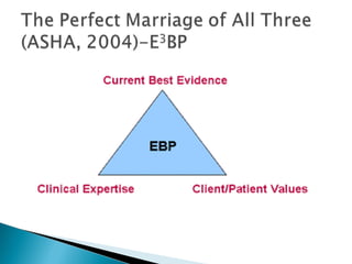 This document discusses evidence-based practice in speech-language pathology. It defines evidence-based practice as integrating clinical expertise, patient values, and the best research evidence. Lower levels of research evidence are still useful if they are the best available. Treatment efficacy focuses on controlled studies while effectiveness looks at outcomes under typical clinical conditions. Clinicians should have an open and honest approach when considering different treatment options and be guided by principles of beneficence, autonomy, nonmaleficence, and justice. Forming answerable clinical questions is important to evidence-based practice.