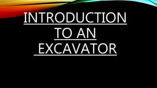 An excavator is a heavy construction machine that uses a bucket and boom to excavate soil and materials. It has a cab for the operator, tracks or wheels for mobility, and a hydraulic arm with attachments to dig and lift. Excavators come in different types for various jobs, including crawler, backhoe, suction, dragline, and wheel excavators. They are used widely in construction, mining, demolition, landscaping, and other industries for digging trenches, loading trucks, handling materials, and more.