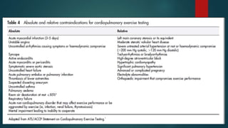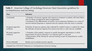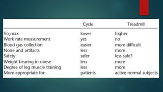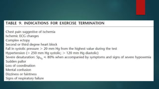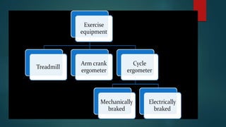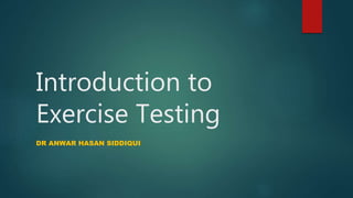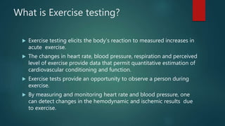 Exercise testing involves measuring physiological responses like heart rate, blood pressure, and oxygen consumption during increasing levels of exercise to assess cardiovascular function and fitness. Key information obtained includes maximum oxygen uptake (VO2 max), which reflects physical fitness. Common protocols incrementally increase workload every 1-3 minutes using a cycle ergometer or treadmill until exhaustion. Tests are used to diagnose or monitor conditions like heart failure and evaluate responses to rehabilitation.