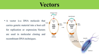 The document discusses expression vectors, which are DNA molecules designed to introduce genes into host cells for protein production. It outlines the differences between cloning and expression vectors, details components essential for their function, and describes various types of expression vectors used in prokaryotic and eukaryotic systems. Applications include recombinant protein production, gene therapy, agricultural biotechnology, and industrial uses.
