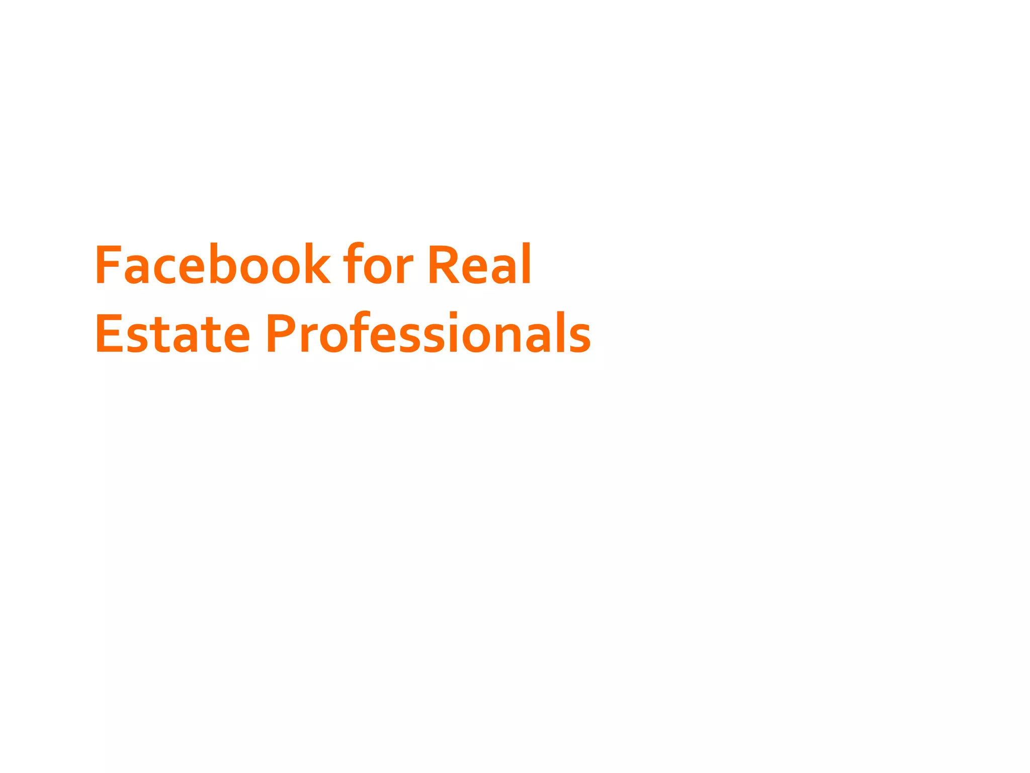 The document outlines strategies for real estate professionals to effectively use Facebook for marketing, emphasizing diverse posting strategies and personal engagement. It provides specific action items for setting up profiles, optimizing privacy settings, and promoting listings while ensuring responsiveness and creativity. Key takeaways include leveraging personal relationships, employing unique content, and establishing a professional image to attract clients.