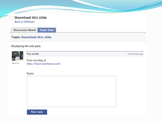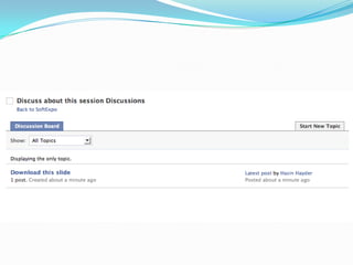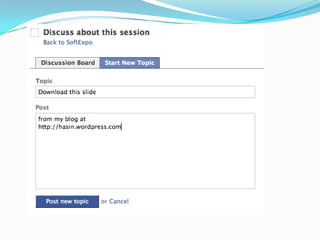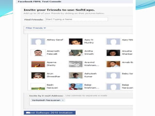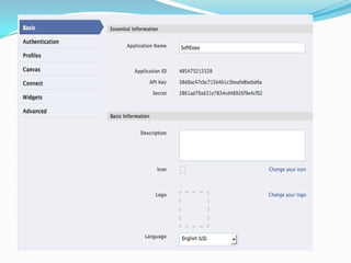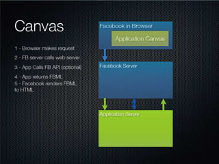 This document provides an overview of Facebook applications, including what Facebook is, the benefits of developing on the Facebook platform, the types of applications that can be developed, basic concepts like authorization, and important components like FBML, FQL, and the REST API. It also demonstrates how to set up a Facebook application and discusses considerations for monetization and examples of successful apps.