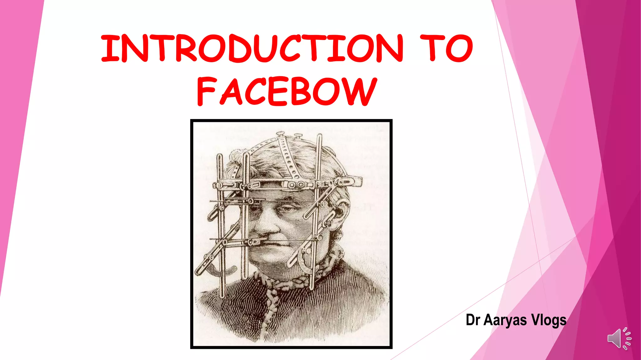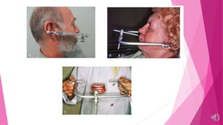 The document provides an introduction and history of the facebow, which is a dental instrument used to record the spatial relationship between a patient's upper jaw and mandibular condyles. It describes how early developers like Bonwill, Balkwill, and Hayes created some of the first articulators and facebow-like devices in the 1860s-1880s to better replicate jaw movements. The document outlines the purposes of the facebow, including establishing balanced occlusion in eccentric jaw positions and verifying jaw relationships when restoring multiple teeth. It notes when a facebow is necessary versus unnecessary for certain dental cases and procedures.