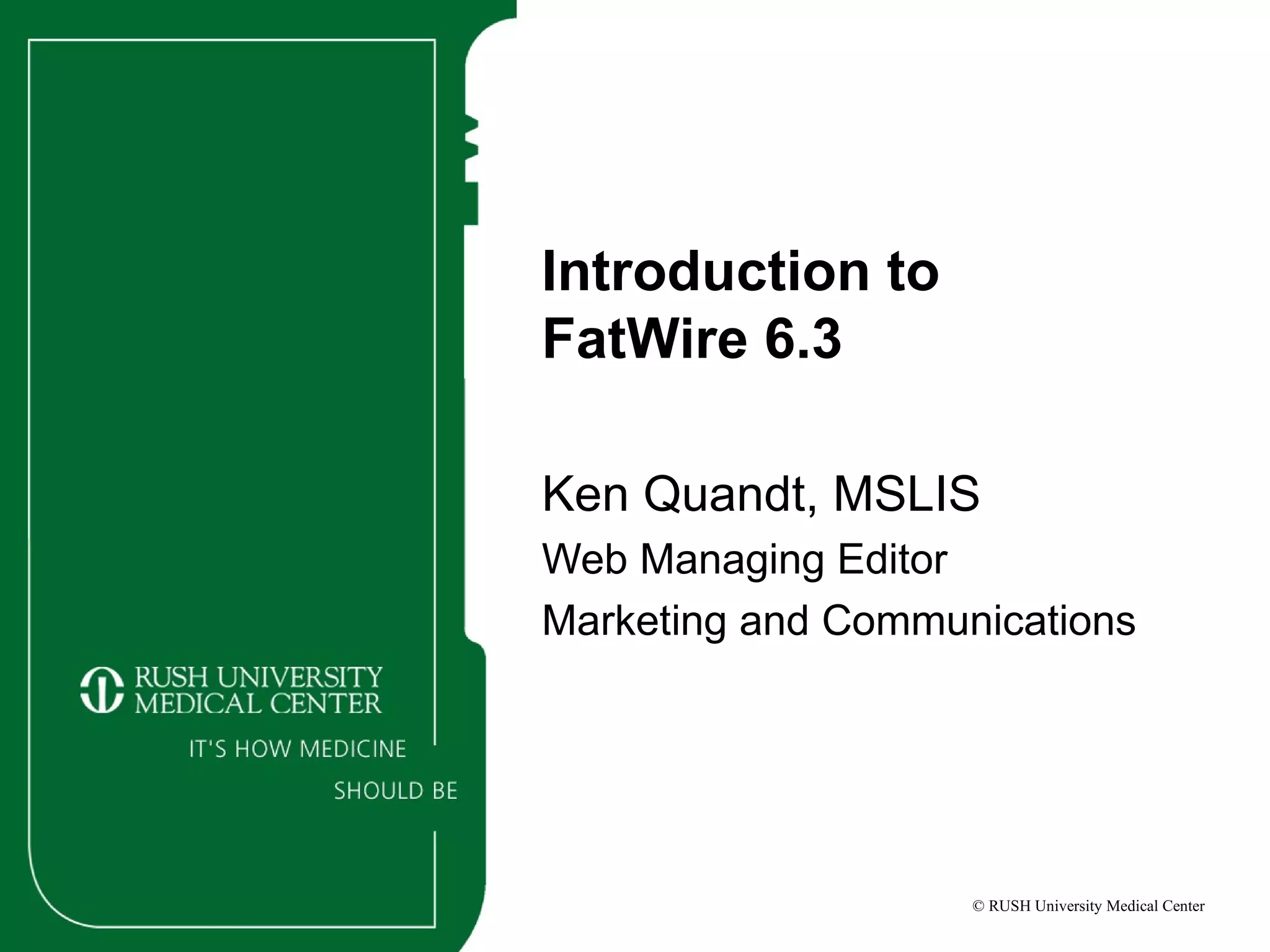 The document provides an introduction to the FatWire content management system and guidelines for writing content for websites. It discusses the goals of websites, types of sites, the importance of usability and the primary audience. It also covers writing concisely and to the point for the web where people have short attention spans. The document outlines how to log into and navigate FatWire to edit pages and content blocks, add or remove elements, and specifics about images. It concludes with contact information for questions.