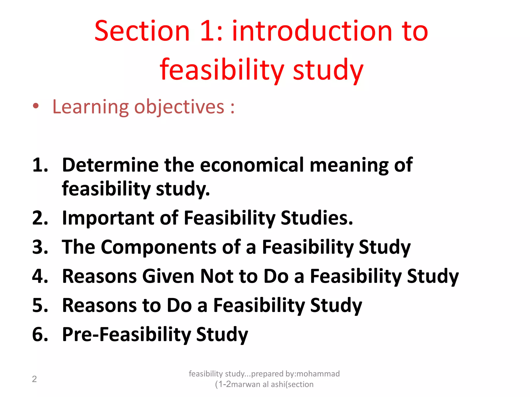 The document discusses the components and importance of conducting a feasibility study for a business venture. It notes that a feasibility study analyzes the viability of an idea and helps determine if a proposed project should proceed. The key components of a feasibility study outlined are market feasibility, technical feasibility, financial feasibility, organizational feasibility, and conclusions. Reasons for and against conducting a feasibility study are also provided.