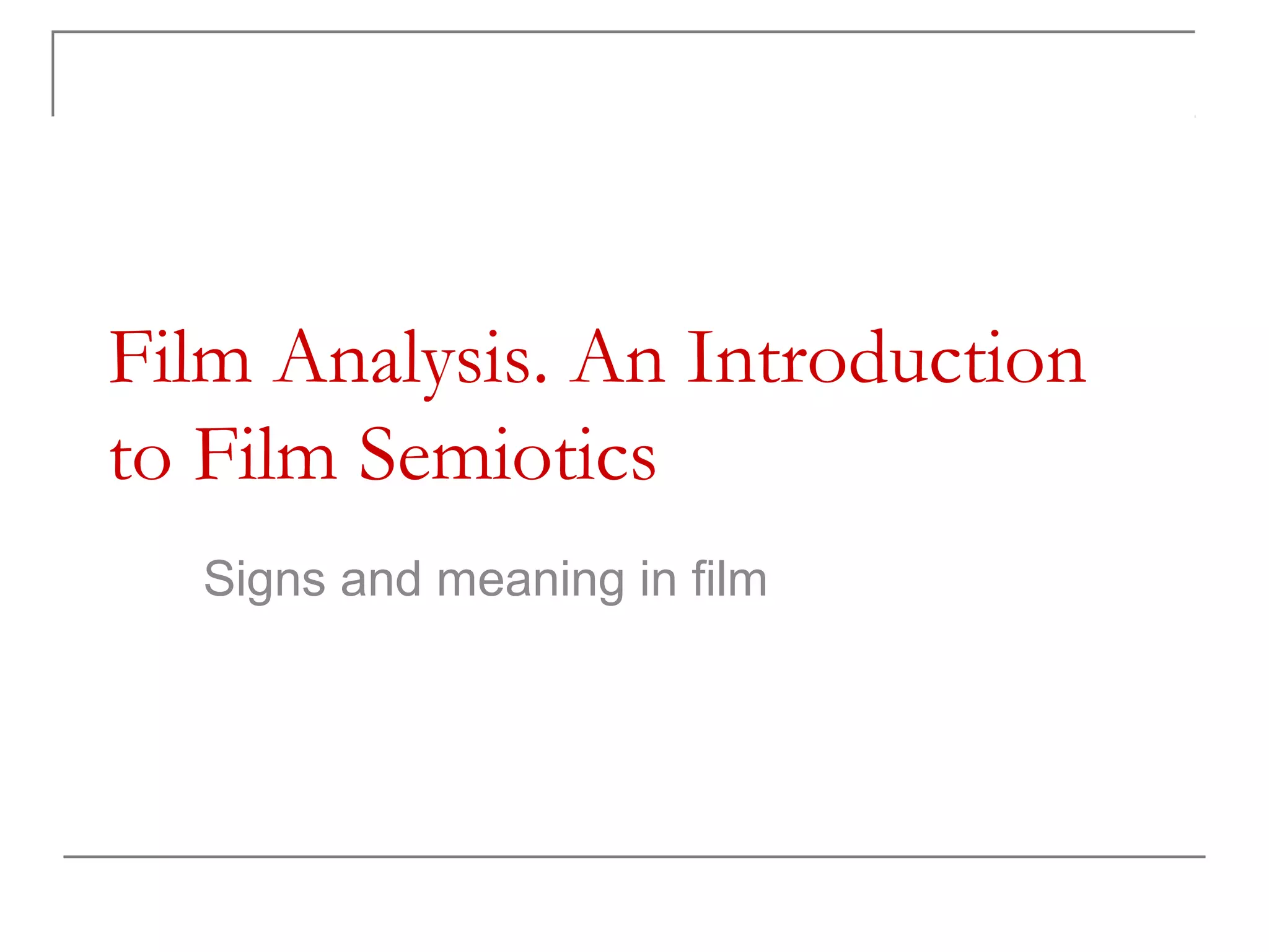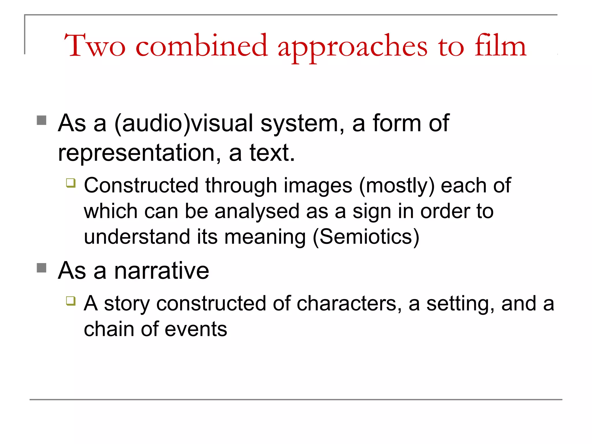 This document provides an introduction to analyzing films through a semiotic lens. It discusses film as both an audiovisual system that can be analyzed through its individual signs/images, as well as a narrative constructed of characters, settings, and events. Semiotics is introduced as the study of signs and how meanings and representations of reality are constructed. Film represents reality through iconic, narrative, and dramatic forms of representation, as well as through its unique cinematic language of images, editing, and more. Analyzing a film involves examining its narrative modes, the experience of mimesis it provides, and interpreting the meanings of its individual images and signs.
