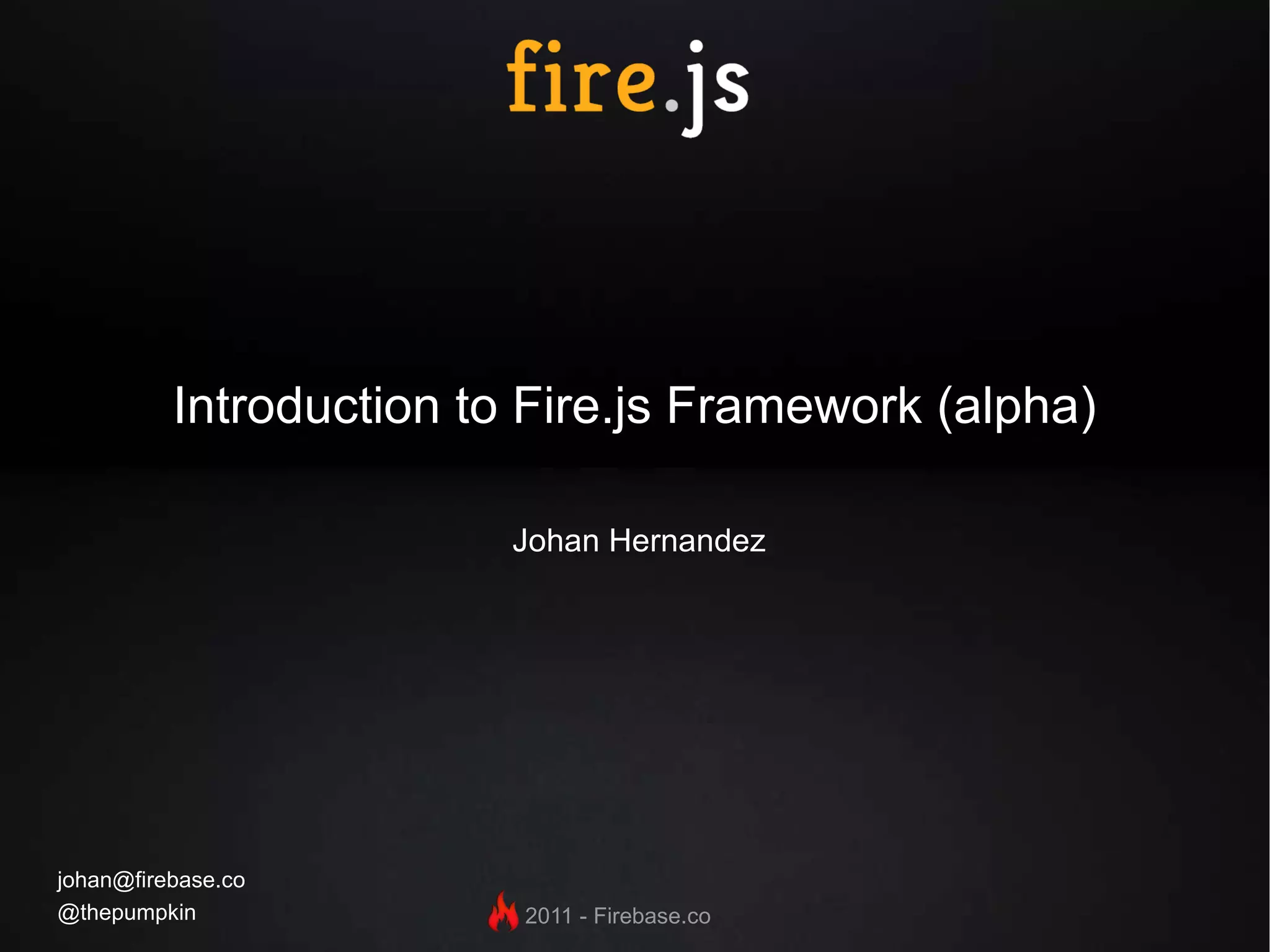 ![Introduction to Fire.js Framework (alpha) Johan Hernandez [email_address] @thepumpkin](https://image.slidesharecdn.com/firejs-111206052013-phpapp01/75/Introduction-to-Fire-js-alpha-1-2048.jpg)