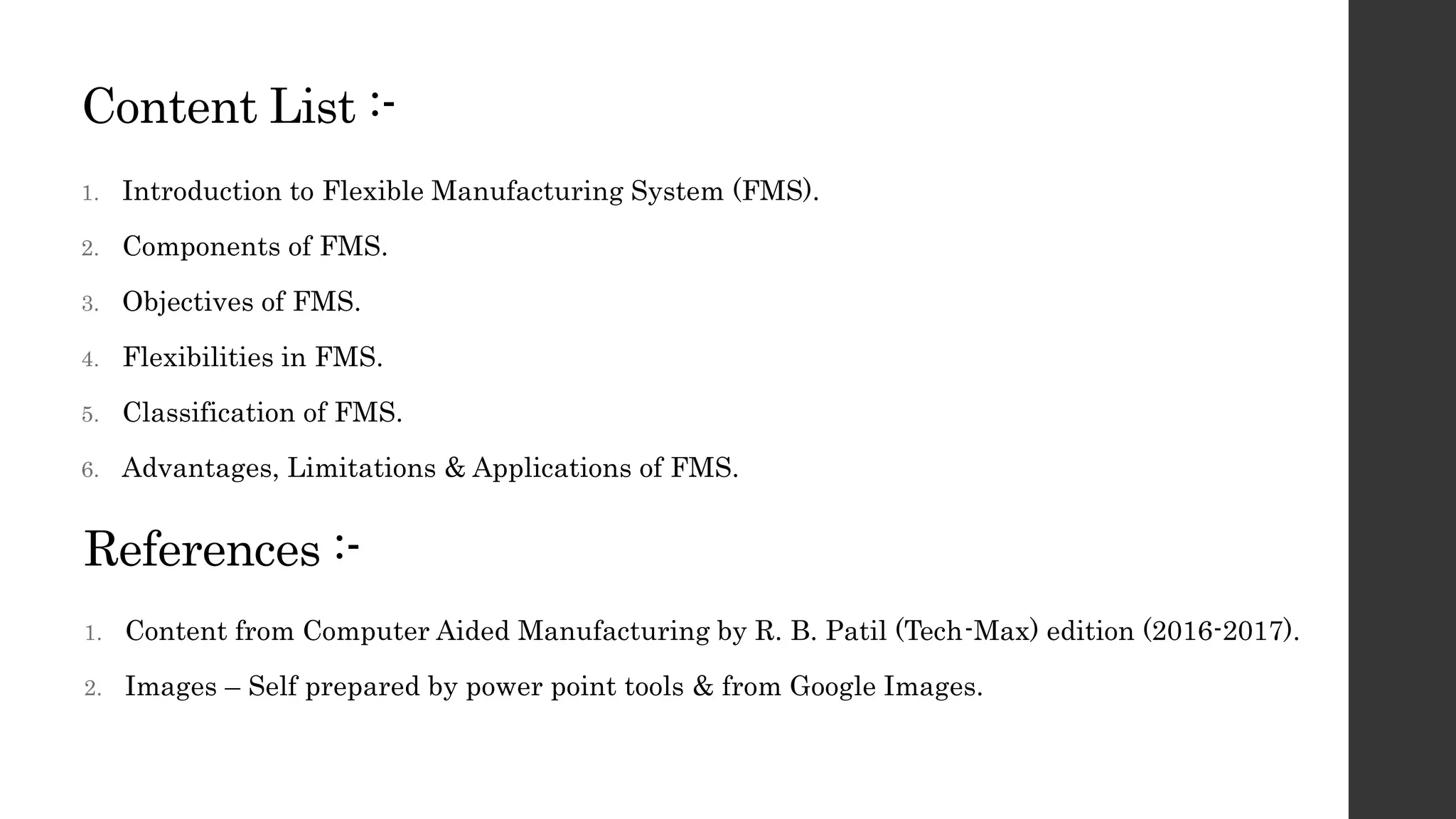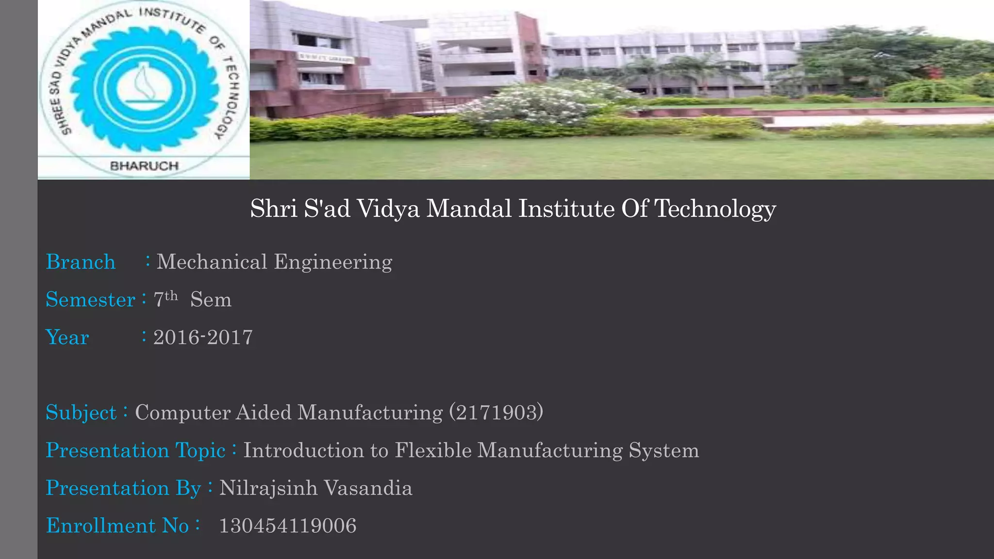 This document provides an introduction and overview of flexible manufacturing systems (FMS). It discusses the key components of an FMS, including workstations, material handling and storage systems, and a computer control system. The objectives of an FMS are described as flexibility in production, automation and integration, reduced lead times, higher productivity, lower manpower needs, and reduced material handling. Different classifications of FMS are presented based on the number of machines, flexibility, and layout type. Advantages include higher utilization rates and flexibility, while limitations include high costs. FMS are applied to products with medium quantities and variety.