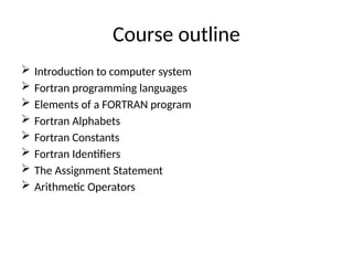 The document outlines the syllabus for a course on Object-Oriented Fortran Programming at Ahmadu Bello University, covering essential computer science topics such as computer systems, programming languages, and specific details about Fortran programming. Key elements discussed include computer hardware and software, Fortran program structure, constants, variables, and the categorization of programming languages. It emphasizes the importance of proper variable declaration and initialization, providing examples of different data types and their properties.