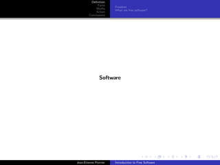 The document provides an introduction to free software, defining its principles, freedoms, and dispelling common myths surrounding it. It highlights key actors in the movement, including Richard Stallman and Linus Torvalds, and emphasizes the accessibility, security, and support provided by community-driven free software. The presentation encourages the use of free software across various platforms and applications, promoting its advantages and community involvement.