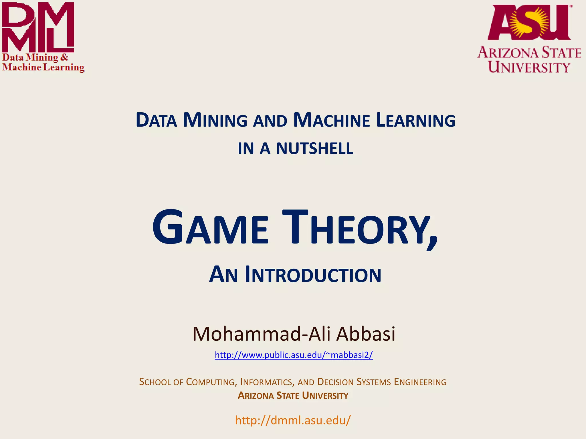 The document provides an introduction to game theory, covering its history, key concepts, and applications. It discusses how game theory analyzes strategic decision-making between interdependent actors. The document outlines different types of games including dominant games, Nash equilibriums, and multiple equilibrium games. It also presents examples like the prisoner's dilemma game to illustrate game theory concepts and strategies.