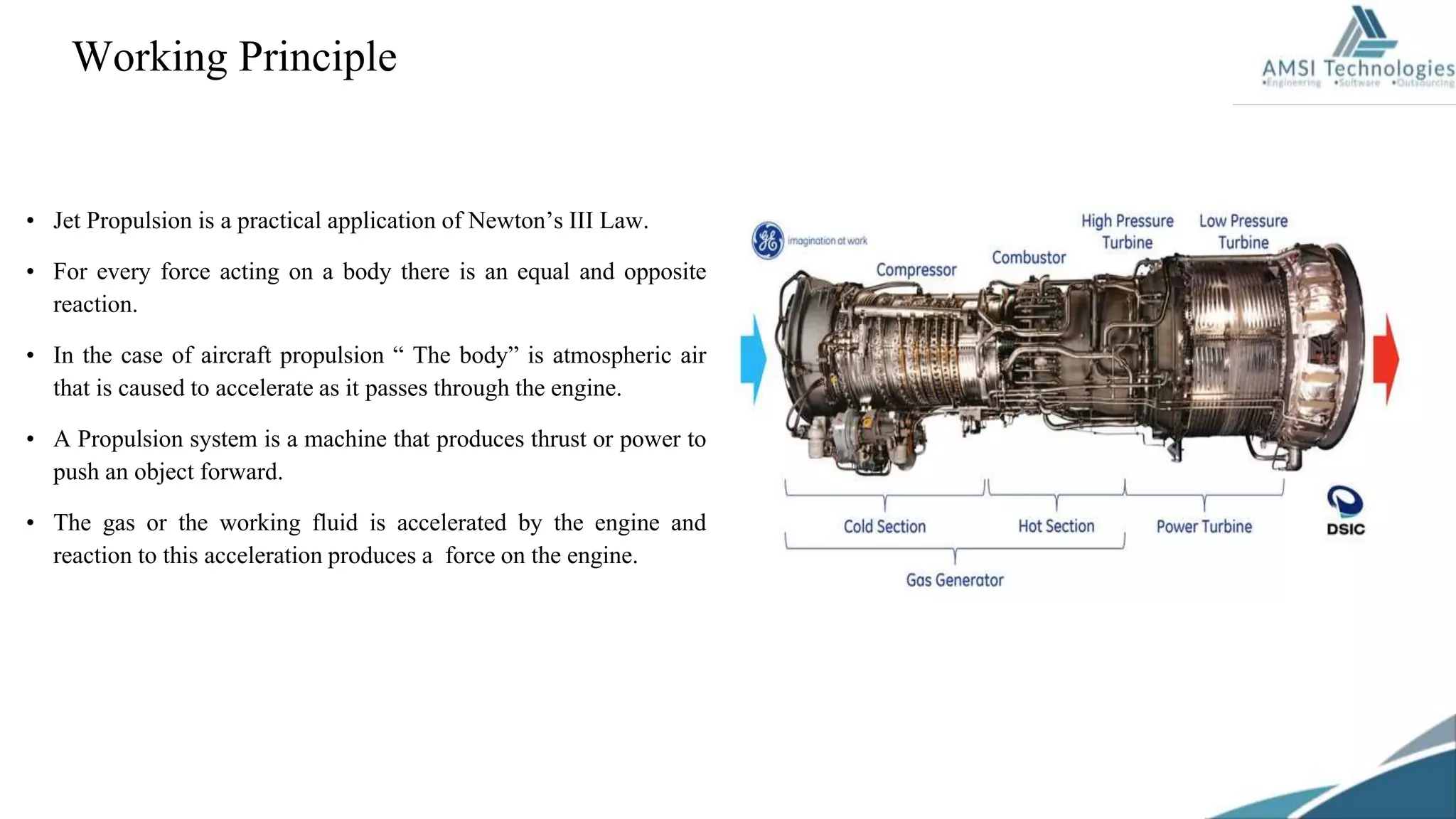 This document provides an introduction to gas turbine engines. It discusses the working principle of jet propulsion based on Newton's third law of motion. It describes the basic components and functions of a gas turbine propulsion system, including compressing air, mixing and igniting fuel, and accelerating the gases to produce thrust. It also discusses different types of gas turbine engines such as turbojets, turbofans, turboprops, and ramjets as well as their applications in aircraft, marine, industrial, and launch vehicles.