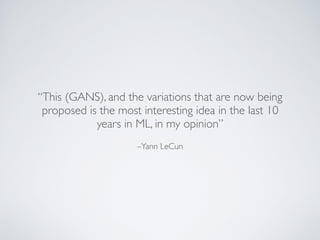 Generative Adversarial Networks (GANs) consist of two competing neural networks, a generator and a discriminator, working against each other to produce realistic data. Training involves alternating between training the discriminator to distinguish real from fake data and training the generator to create data that can fool the discriminator. This document outlines the fundamental concepts of GANs, including their training process and the use of variations such as Variational Autoencoders (VAEs).