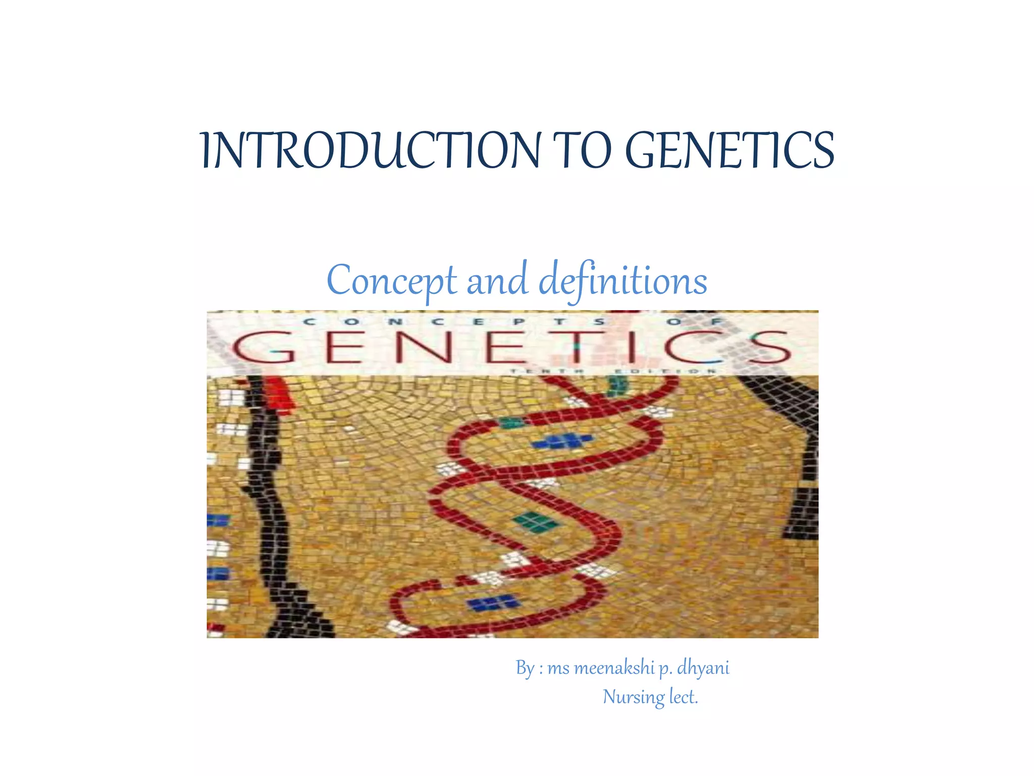 Genetics is the science of how characteristics are transmitted from parents to offspring. It deals with the transmission and inheritance of traits. Originally introduced in 1906 by Bateson, genetics comes from the Greek word "gene" meaning "to become" or "to grow into". Medical genetics focuses on the inheritance of hereditary disorders and identifies pediatric disorders associated with birth defects. Recent advances help understand how genetics impact common diseases in adults like cancer, Alzheimer's, and diabetes.