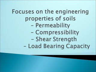 Geotechnical engineering is a branch of civil engineering that applies soil mechanics, rock mechanics, and groundwater conditions to design foundations, retaining structures, earth structures, and environmental containment systems. Geological engineers use principles of earth sciences and geotechnical engineering to solve problems involving soil, rock, and groundwater, and to design underground structures. They often work with other professionals on major projects involving site selection, natural hazards, foundations, groundwater, slopes, dams, and environmental remediation.