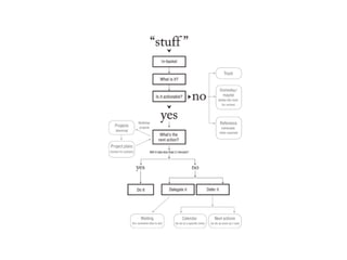This 3 sentence summary provides the high level information from the document: Getting Things Done is based on David Allen's book and discusses having "open loops" or undefined tasks that cross your path each day as "things"; these "things" need to be captured and processed so they don't stay as undefined tasks on your mind. The document recommends capturing all "things" that come up to clear your head and keep an organized system for remaining tasks.