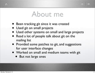 This document provides a brief introduction to Git, a distributed version control system. It describes what Git is and some of its key features, such as tracking changes to files over time, supporting distributed development, efficient object storage, easy branching and merging, and universal public identifiers. The document also discusses some of Git's internal mechanisms, such as SHA-1 hashes to uniquely identify objects, the index cache, and how commits and branches work.