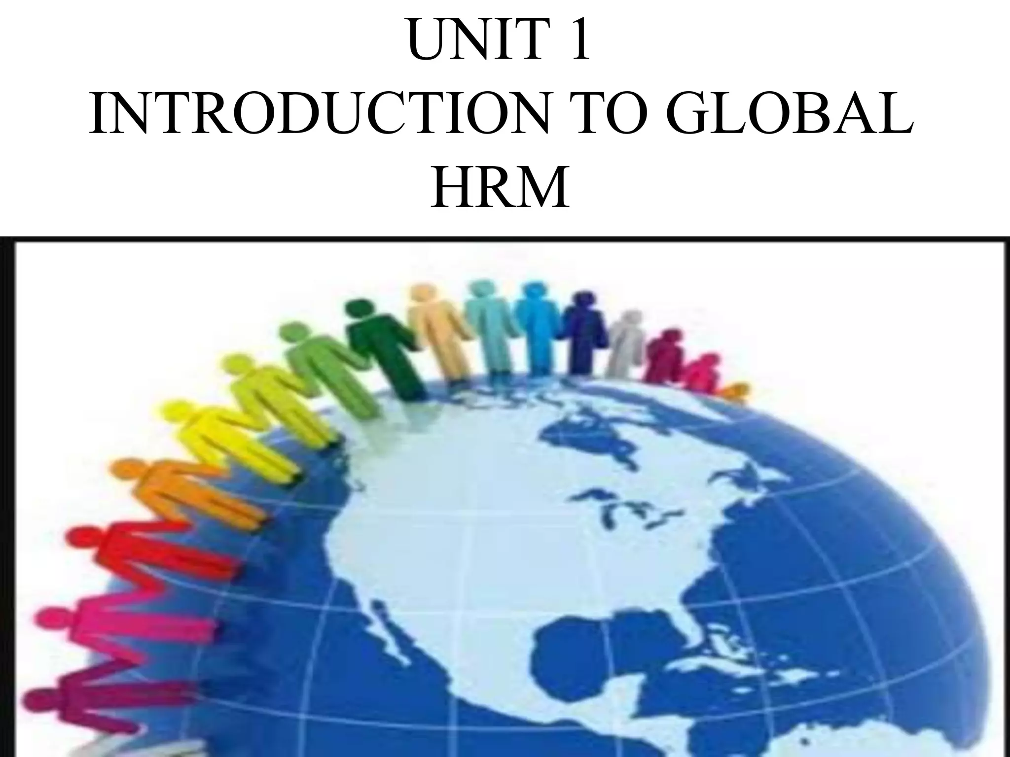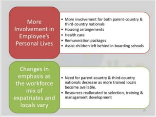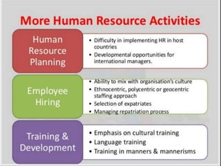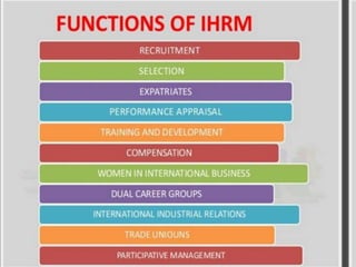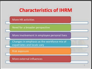 This document provides an overview of key topics in international human resource management (IHRM). It defines IHRM and discusses the differences between domestic and global HRM. Some of the main challenges of IHRM include complying with different countries' labor laws, acquiring and retaining talent internationally, developing leaders who can adapt to different cultural contexts, and balancing local and corporate priorities. The document also outlines different strategic approaches companies can take to IHRM, such as ethnocentric, polycentric, and geocentric policies, and discusses some common barriers to effective global human resources management.