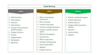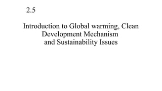 The document discusses global warming and its causes, specifically focusing on greenhouse gas emissions and their impact on the earth’s climate. It outlines the Kyoto Protocol's mechanisms for emission reductions, including the Clean Development Mechanism (CDM) aimed at helping developing countries generate certified emission reduction credits. Additionally, it highlights renewable and non-renewable energy sources, discussing the challenges and opportunities associated with CDM projects in Nepal.