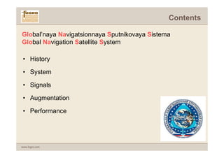 This document provides an introduction and overview of Glonass, the Russian global navigation satellite system. It discusses the history and development of Glonass, the system components including satellites and ground control segment, orbital characteristics, signals and navigation message, augmentation system for differential corrections, modernization plans, and examples of current and potential performance when using Glonass in combination with GPS.