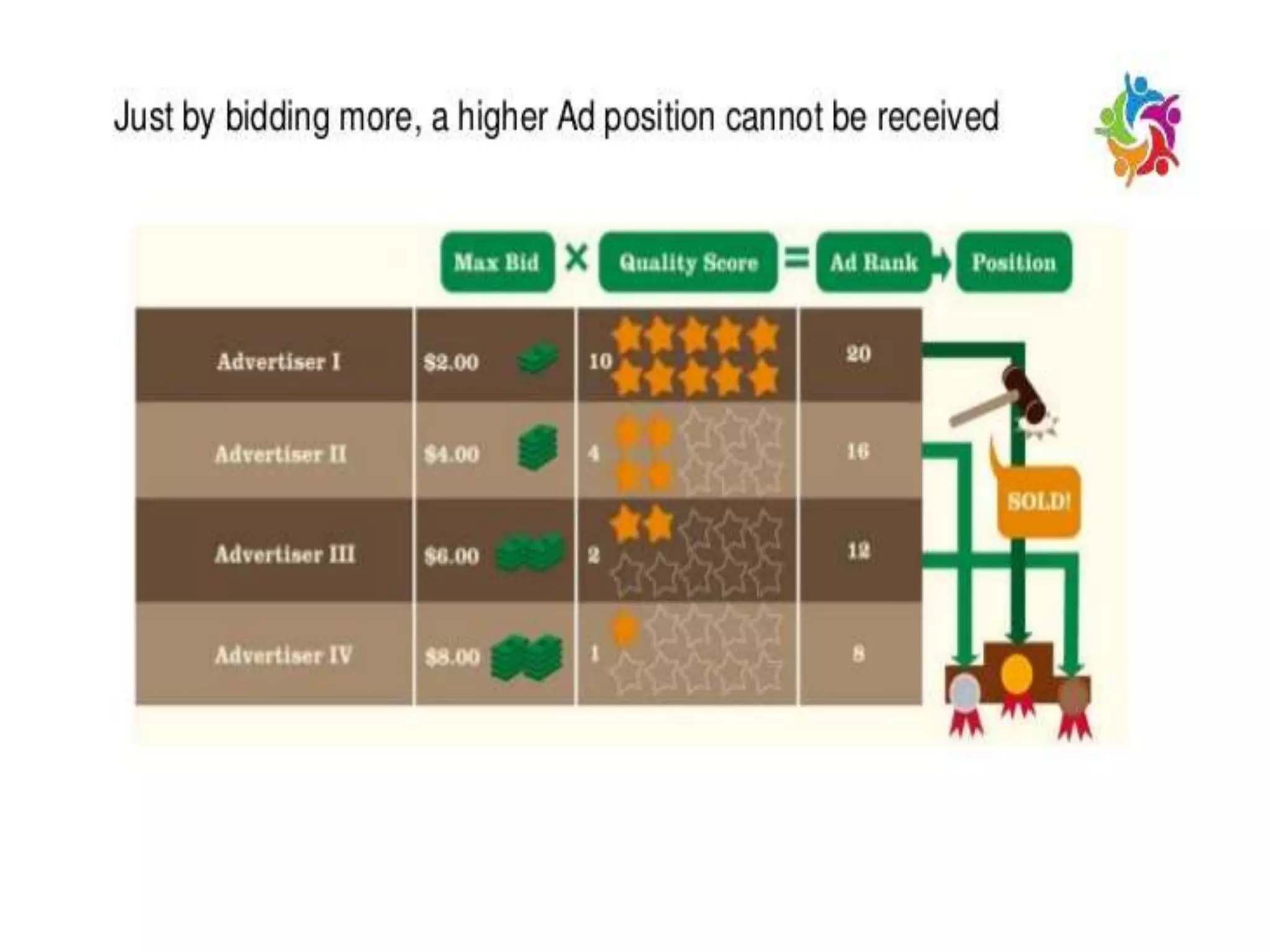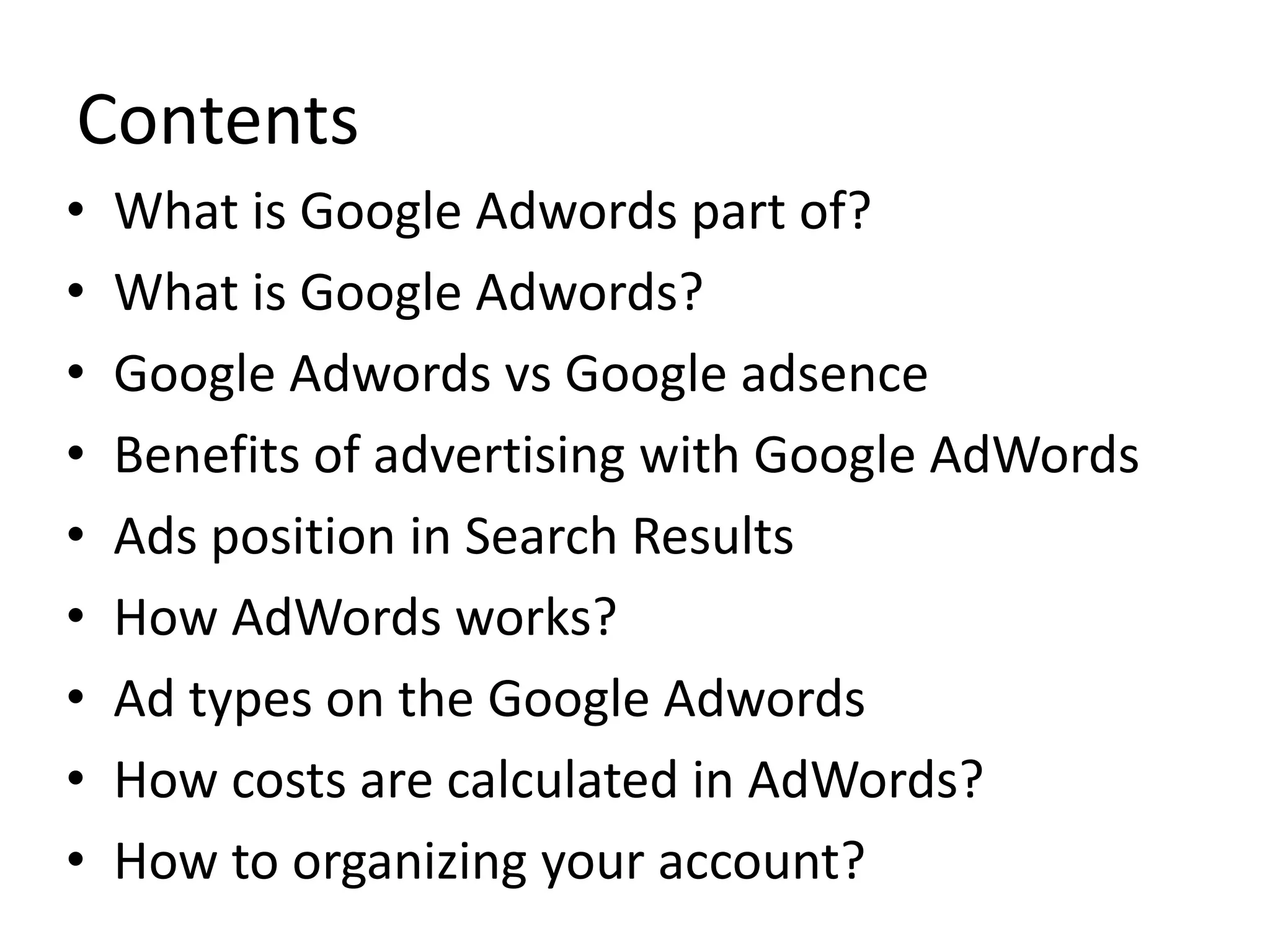 Google Adwords is Google's online advertising program that lets businesses reach new customers and grow by placing ads in Google search results. Key benefits include choosing where ads appear, setting a budget, measuring impact, and no minimum spending commitment. Advertisers pay only when ads are shown, clicked, or generate other actions like video views. Accounts are organized by creating ads, enhancing them with extensions, understanding ad position and rank, and evaluating quality score based on expected click-through rate, relevance, and landing page experience.