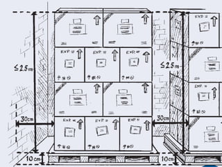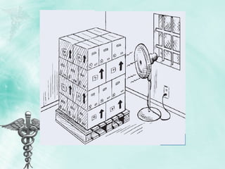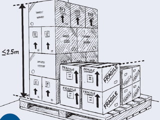 Arrange the Storeroom & Shelves as follows: If using pallets, stack cartons on pallets…. At least 10 cm (4 inches) off the floor At least 30 cm (1 foot) away from the walls and other stacks No more than 2.5 m (8 feet) high (general rule)