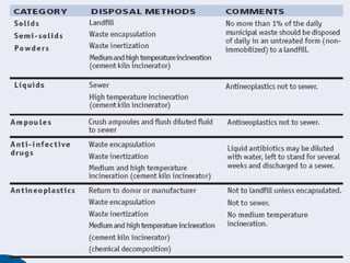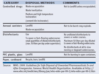 Pharmaceutical Disposal Particularattention must be given to disposal of the following categories of pharmaceuticals Controlled substances, such as narcotics and psychotropic medicines Anti-infective drugs Antineoplastics Cytotoxic anti-cancer drugs, toxic drugs Antiseptics and disinfectants