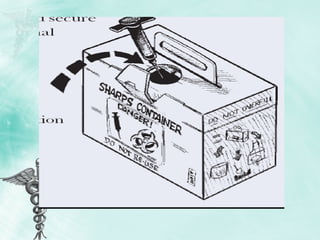 Safety Boxes Donot recap syringes before disposal Place the syringe and needle in the sharps box immediately after use Keep the sharps box where the injections are given Do not overfill the sharps containers (about Âľ full)