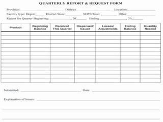 Tasks According to Reorder Interval  & Reporting Schedule  (Usually Monthly or Quarterly) Assess stock situation Complete and submit requisition form (indent or “pull” systems) Determine issue quantity and issue products (“push” systems)