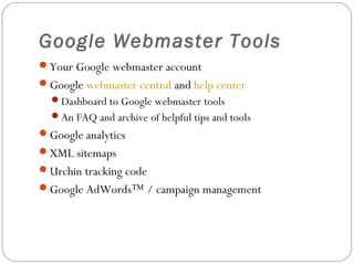 The document provides an overview of Google Webmaster tools and their functionalities, including website traffic analysis, the use of XML sitemaps, and the integration of Google Analytics for tracking visitor behavior. It emphasizes the importance of managing ad campaigns via Google AdWords and suggests a step-by-step approach to effectively utilize these tools. Additional resources and links for further learning about these tools are also included.