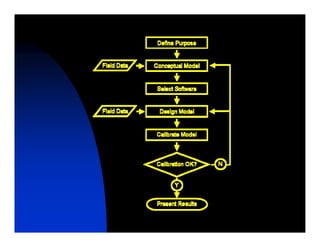 This document provides an introduction and overview of groundwater modeling. It discusses why groundwater modeling is needed for effective groundwater management. It outlines the modeling process, including developing a conceptual model, selecting governing equations, model design, calibration, validation, and using the model for prediction. It describes different types of mathematical models, including analytical, finite difference, and finite element models. It emphasizes that a modeling protocol should establish the modeling purpose and ensure the conceptual model adequately represents the system behavior. The document stresses the importance of calibration, verification, and sensitivity analysis to evaluate a model's ability to reproduce measured conditions and the effects of uncertainty.