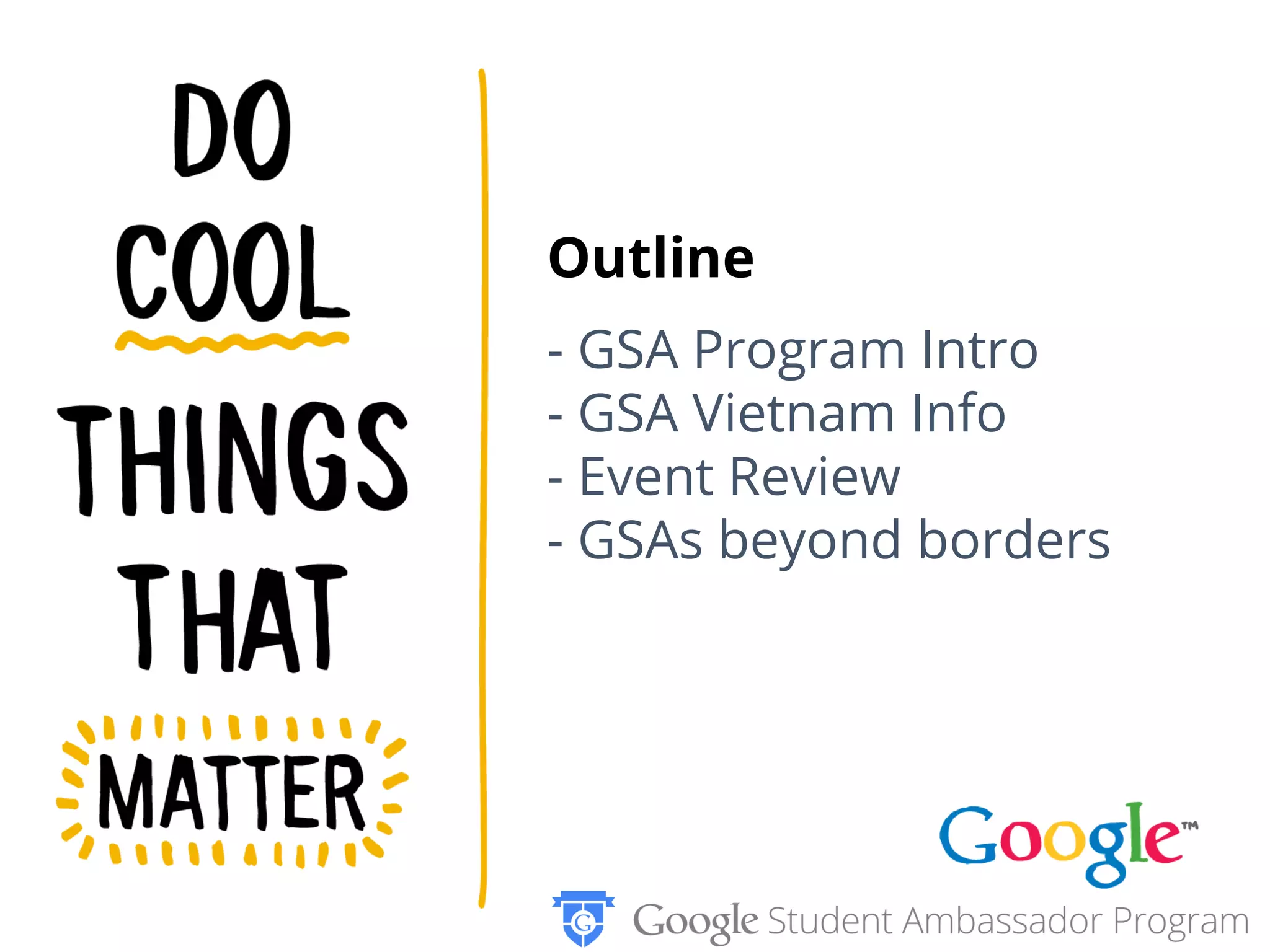 This document provides information about Google Student Ambassadors (GSAs) in Vietnam, including brief biographies of several GSAs. It discusses the GSA program introduction in Vietnam, as well as GSAs involvement in international programs and events beyond Vietnam's borders, such as meetups with GSAs from other countries. Individual GSAs are highlighted for their academic and professional accomplishments.