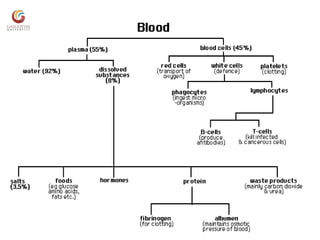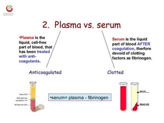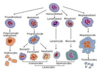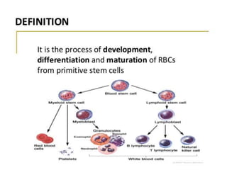 The document provides an introduction to the topic of hematology, covering definitions of hematology, the composition and functions of blood, different cell types found in blood and their roles, basic hematological tests, and branches of hematology including immunohematology and transfusion medicine. Key concepts covered include the components and volume of blood, functions of red blood cells, white blood cells, platelets, and the processes of erythropoiesis and hemostasis.