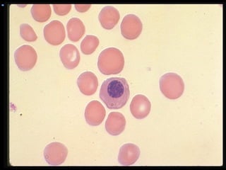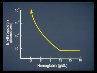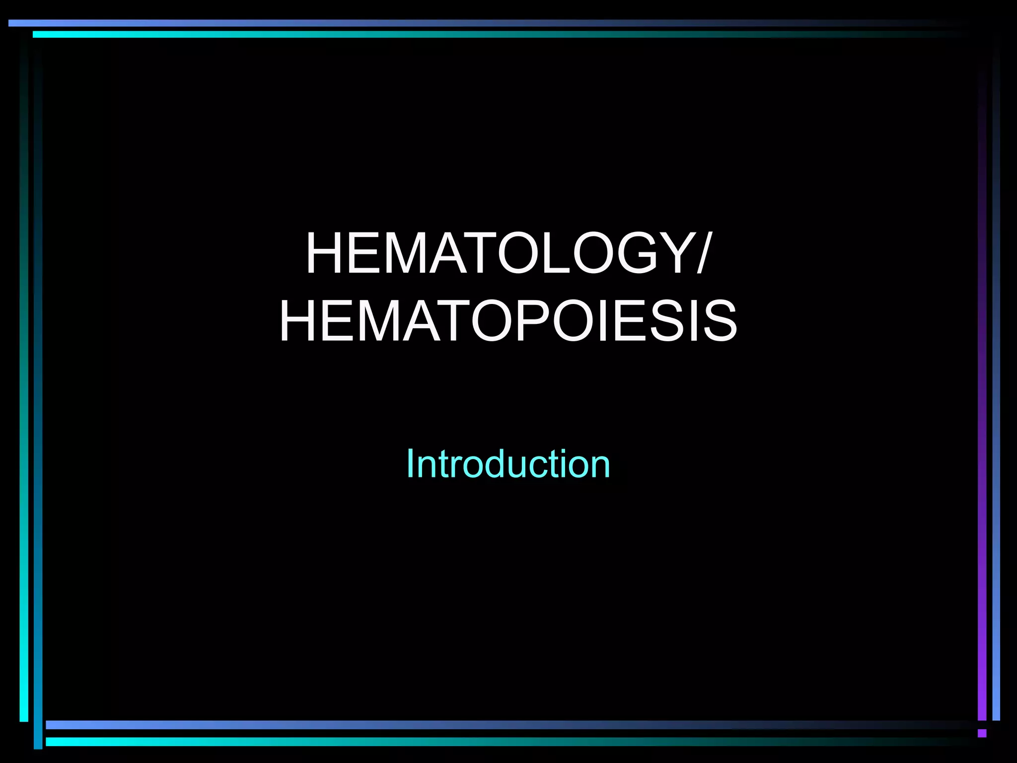 This document discusses hematology and hematopoiesis. It summarizes that hematology is the study of blood and its components, which provide nutrients, remove waste, and protect the body. Hematopoiesis, or blood cell formation, occurs exclusively in the bone marrow and involves pluripotent stem cells differentiating into various blood cell types through cytokine influences. In particular, it focuses on erythropoiesis, the formation of red blood cells, which involves erythropoietin signaling proliferation and differentiation of red blood cell precursors over 5-7 days from pronormoblast to reticulocyte to mature red blood cell.
