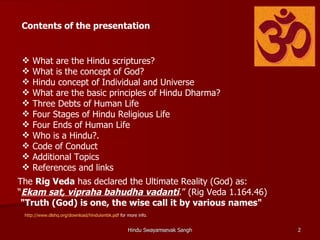 Hinduism is one of the world's oldest religions, with over 1 billion followers worldwide. It believes in an eternal spiritual principle called Sanatana Dharma. The core scriptures are the Vedas, which form the basis of Hindu beliefs and philosophy. Hinduism sees divinity in all of creation and believes in an impersonal and personal conception of God. It teaches that all individuals have an eternal soul (Atman) that is ultimately one with the divine (Brahman).