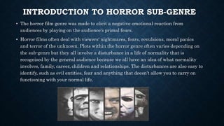 This document discusses various sub-genres of horror films. It outlines the key conventions and examples of supernatural, slasher, and psychological horror sub-genres. In supernatural films, evil spirits and possessions are common threats. Slasher films feature psychopathic killers targeting teenagers. Psychological horrors aim to undermine the audience's trust through twisted characters and plot twists. Key conventions include isolated settings, signature weapons, final girls, and graphic depictions of violence.