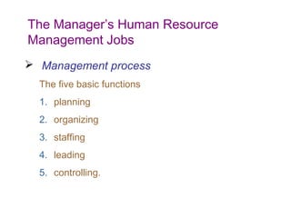 This document provides an overview of human resource management (HRM) concepts for managers. It discusses the basic HRM functions managers are responsible for, including planning, staffing, leading, and controlling. It also outlines the specific HRM jobs managers must perform, such as recruiting, selecting, orienting, and developing employees. Finally, it discusses how the role of the HR professional is evolving to become more strategic and business-focused through the use of metrics, technology, and partnerships with top management.