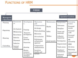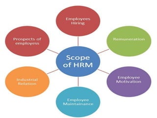 This document discusses human resource management (HRM). It defines HRM as a management function concerned with hiring, motivating, and maintaining employees in an organization. The key functions of HRM include procuring employees, developing employees, compensating employees, integrating employee and organizational interests, motivating employees, and providing employee welfare. The objectives of HRM are to achieve individual development, effectively utilize human resources, establish good work relations, ensure employee satisfaction, help the organization achieve its goals, and maintain a competent and willing workforce.