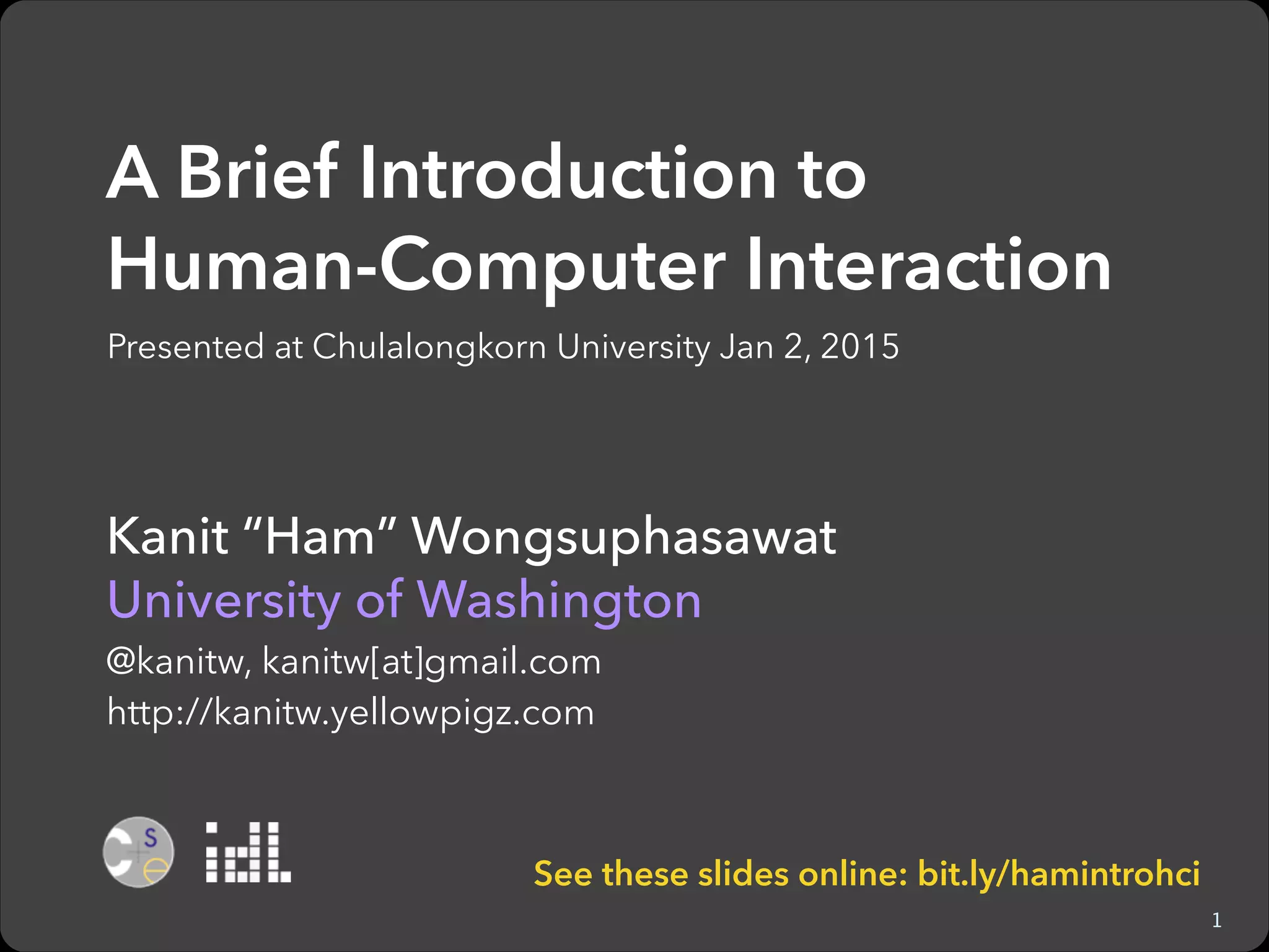 This document provides an introduction to human-computer interaction (HCI) presented by Kanit "Ham" Wongsuphasawat. It outlines the key topics covered in the presentation including a brief history of HCI, the user-centered design process involving prototyping and evaluation, areas of HCI research such as input methods and ubiquitous computing, and opportunities to study HCI in graduate programs. The presentation aims to give attendees an overview of the field of HCI.