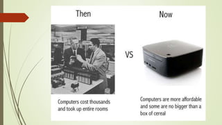 This document provides an introduction to information and communication technology (ICT). It discusses the evolution of computers from first to fifth generation technologies and how ICT has changed lives and society. The document notes that ICT allows information processing and sharing from anywhere at any time using electronics, computers and communication devices. It also discusses how ICT has impacted the Philippines by highlighting statistics on cellphone and internet usage and employment in ICT sectors. Finally, it includes questions to interview a local business owner about their use of and perspectives on ICT.