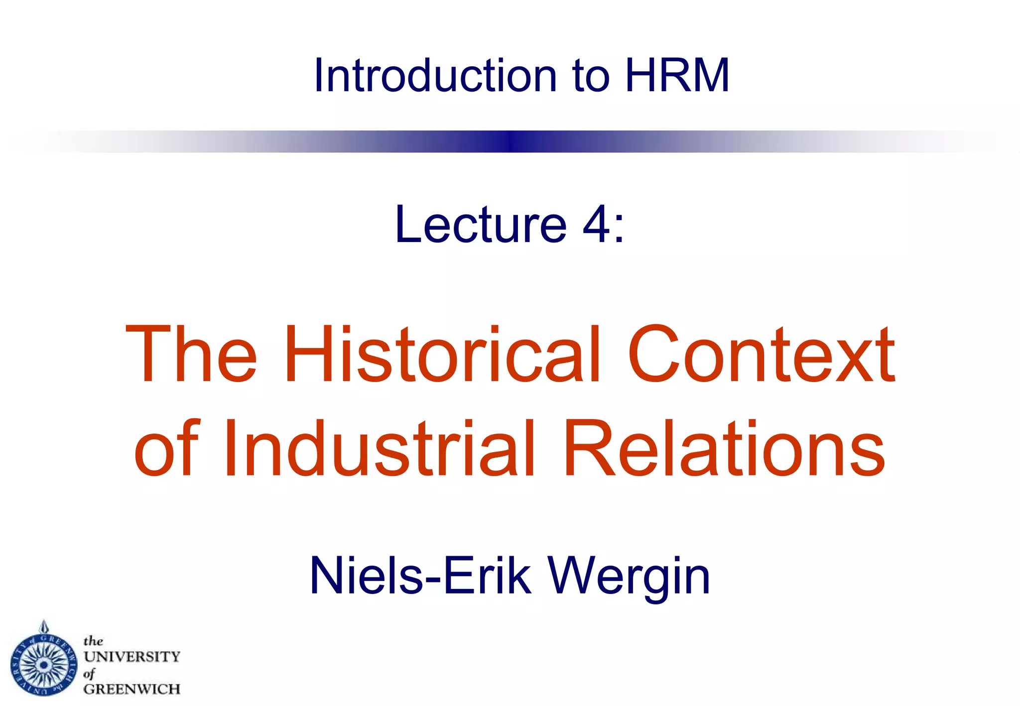 The document discusses the historical context of industrial relations in the UK from the late 18th century to present day. It covers the development of trade unions and employers' organizations, as well as employment law and institutions. Trade unions first emerged in response to the industrialization and formation of a working class in the late 18th century. Over the 19th century, unions grew in size and legal recognition, while employers also organized themselves. Government policy shifted from hostility to support for collective bargaining between 1900-1970s. Conservative governments under Thatcher in the 1980s-90s significantly reformed employment laws weakening unions and shifting to local bargaining.