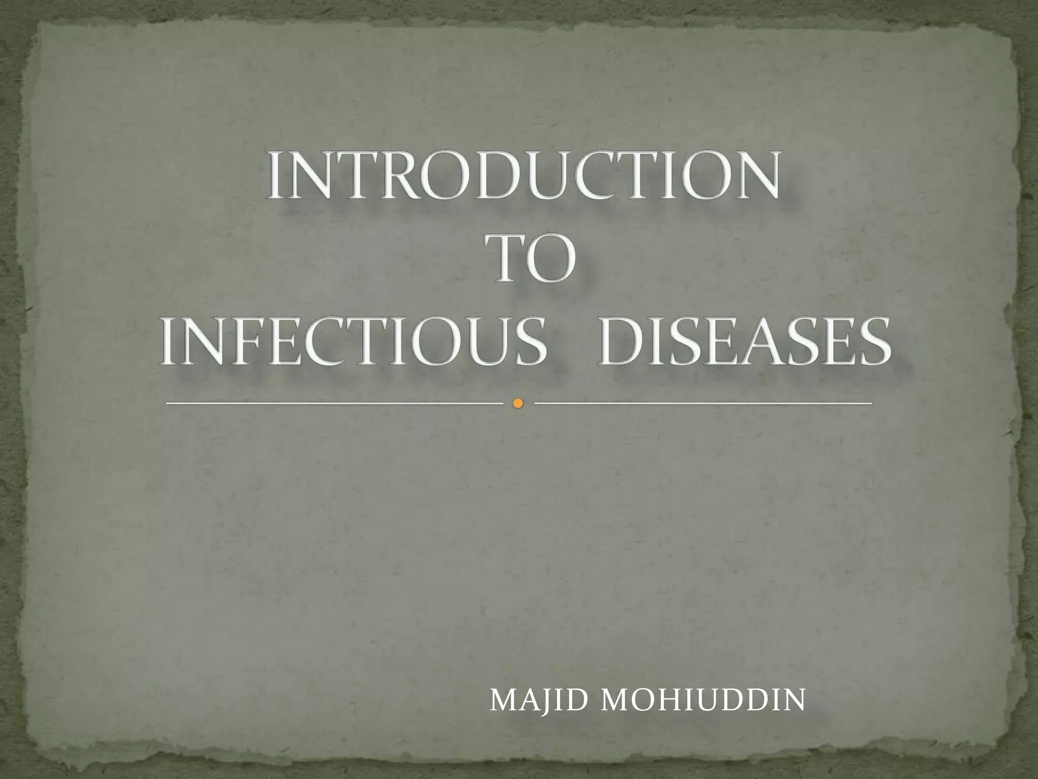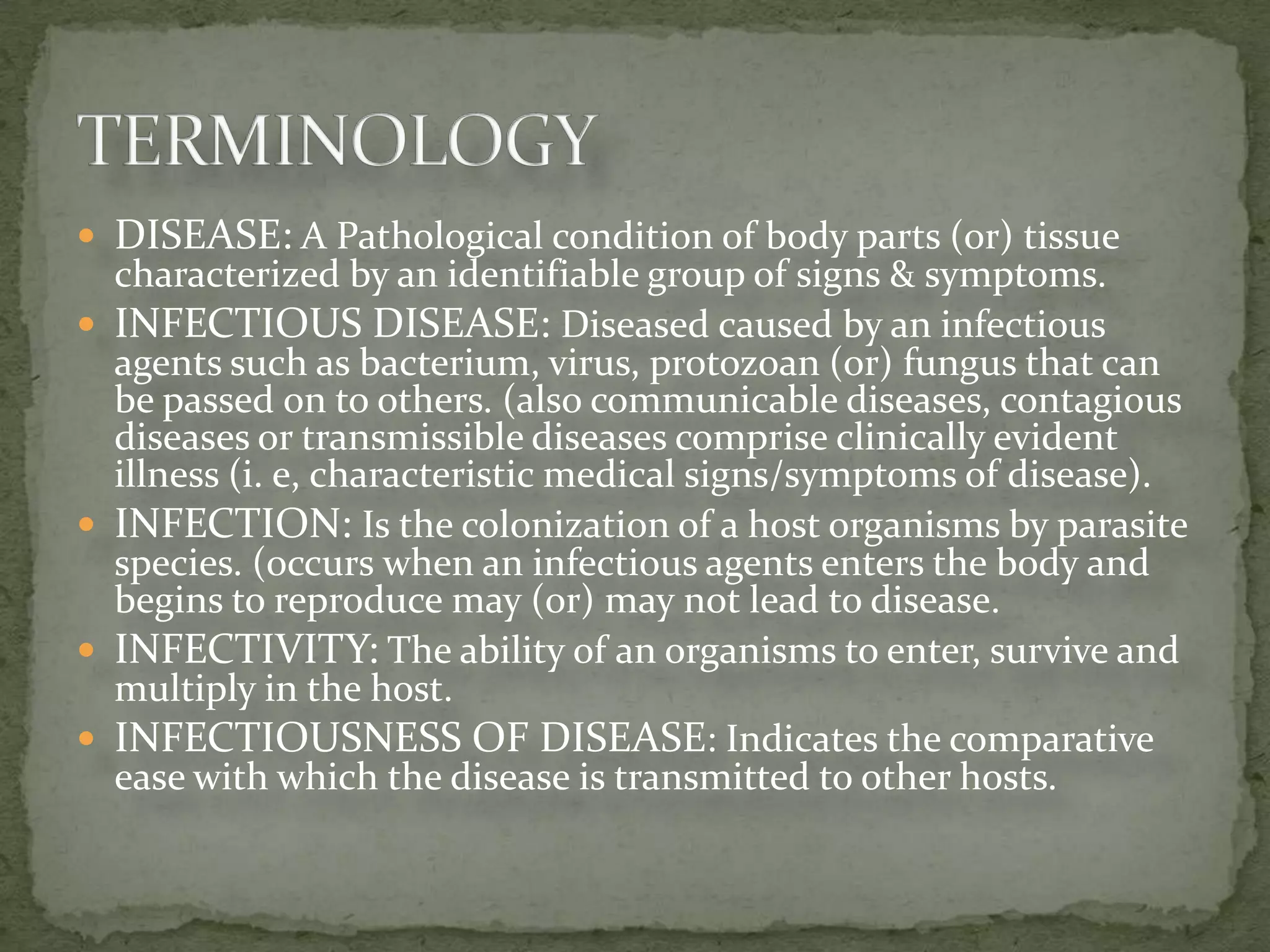 The document discusses infectious diseases and key related concepts. It defines infectious disease as a disease caused by an infectious agent like a bacterium, virus, fungus or parasite that can be transmitted between hosts. It also defines and explains related terms like infection, infectivity, pathogenicity, virulence, and provides examples of major infectious diseases and their causes of death worldwide. The document also covers the history of infectious diseases and advances in the field like germ theory and the development of vaccines and antibiotics.
